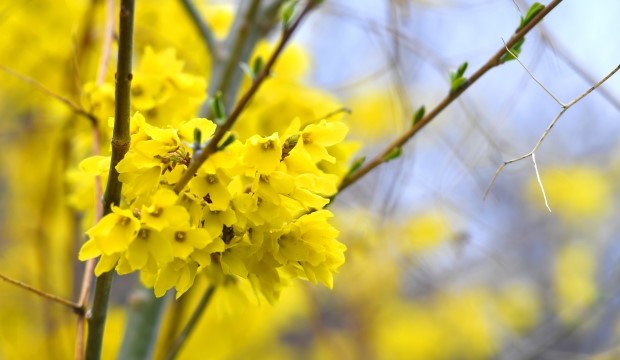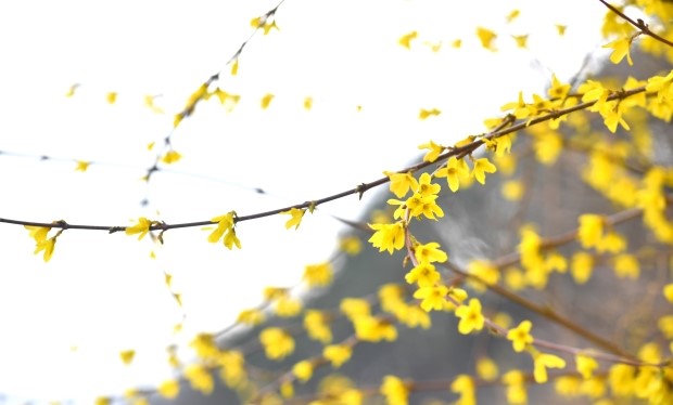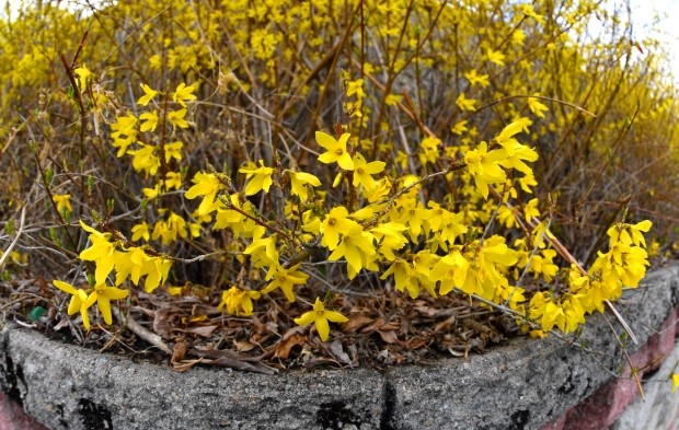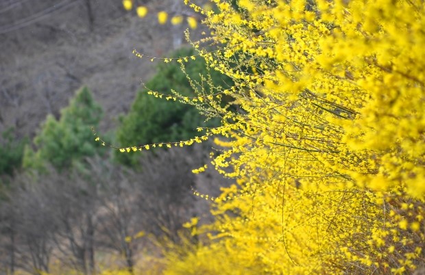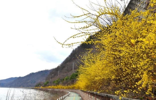 4월에 찾아온 꽃샘추위에도 불구하고, 11일 화천군 화천읍 붕어섬 인근 북한강 자전거길이 봄의 전령 개나리로 샛노랗게 물들어 있다.