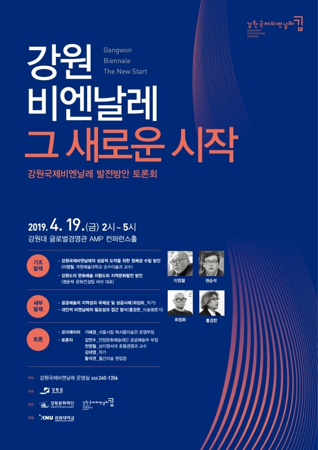 (재)강원문화재단(이사장 김성환) 강원국제비엔날레 운영실은 오는 4월 19일(금) 14시부터 3시간 동안 강원대학교 글로벌경영관 AMP 컨퍼런스홀에서 강원국제비엔날레의 정체성 확립과 앞으로의 비엔날레 행사 방향 설정을 위한 ‘발전방안 토론회, <강원, 비엔날레, 그 새로운 시작>’을 개최한다.