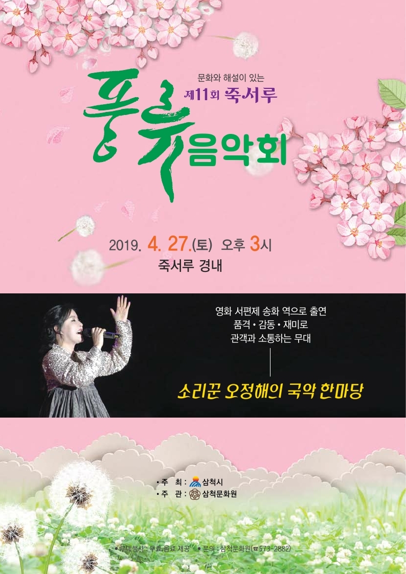 생동하는 봄기운을 담은「제11회 죽서루 풍류 음악회」의 올해 첫 무대가 오는 4월 27일(토) 오후 3시 삼척 죽서루 경내에서 그 막이 오른다.