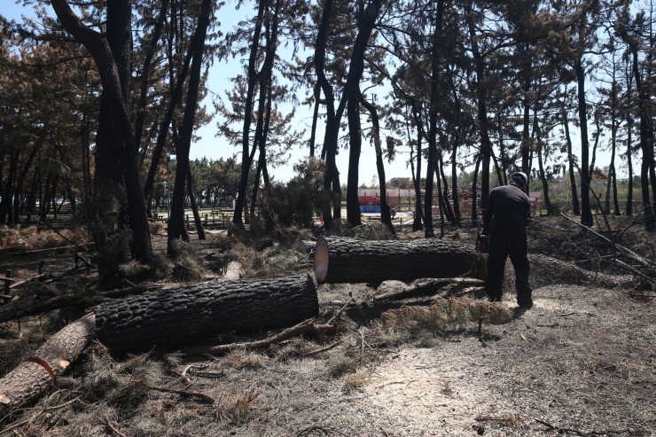 동해시(시장 심규언)가 지난 5일 발생한 대형 산불로 피해를 입은 망상오토캠핑리조트의 산불 피해목을 신속하게 정비하고 있다.