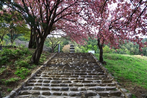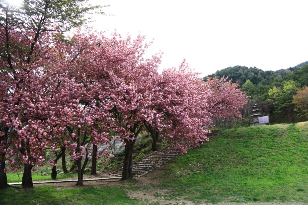 진전사지 삼층석탑으로 올라가는 계단 끝에는 봄을 전하던 벚꽃이 모두 질 때쯤 뒤이어 피는 겹벚꽃이 탐스러운 자태를 뽐내며 상춘객의 마음을 달달하게 적셔준다.
