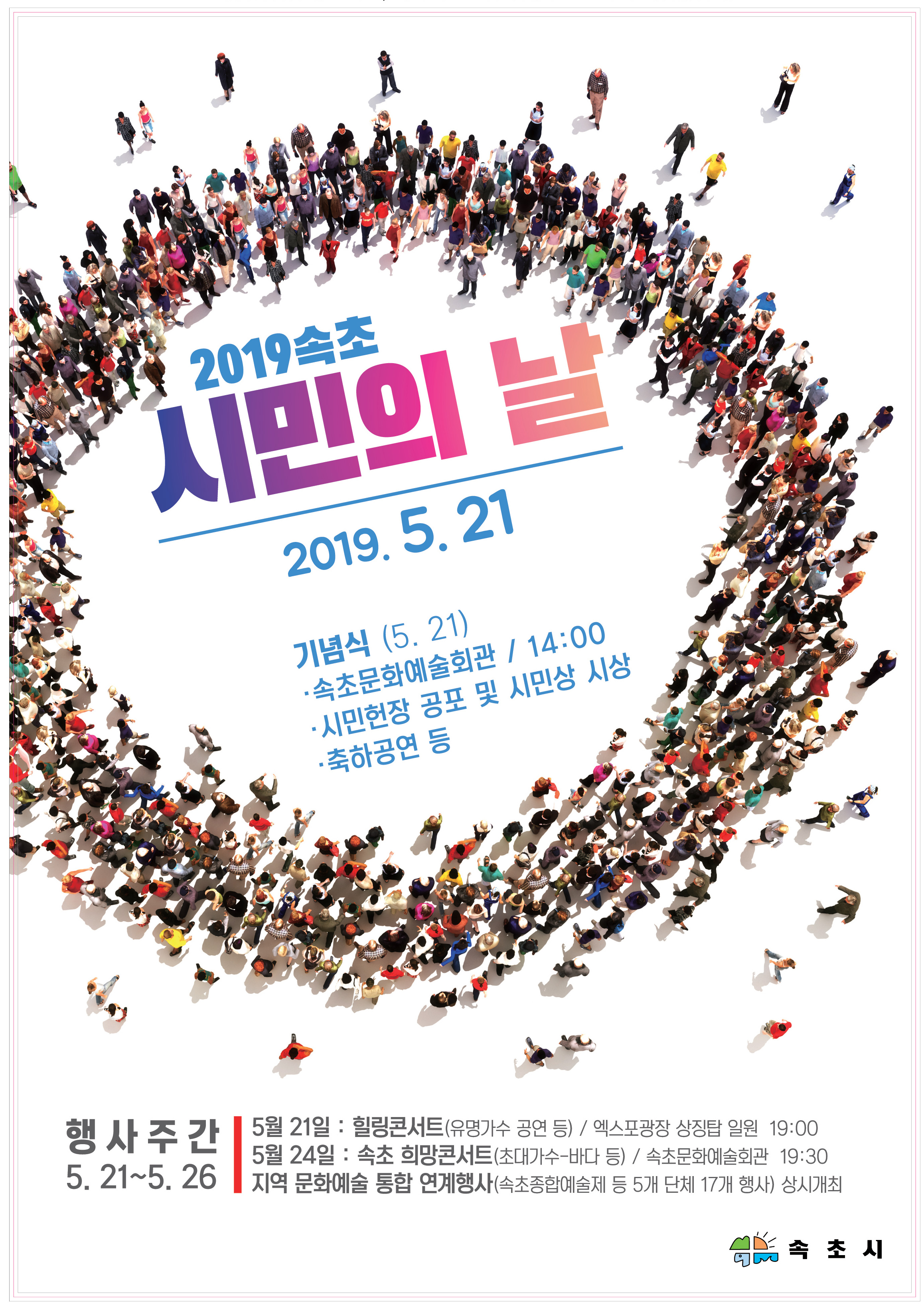 속초시가 새롭게 지정한 5월 21일 ‘속초시민의 날’을 맞이하여 지역의 다양한 문화예술 행사와 연계해 각계각층 시민과 관광객이 어울려 소통․공감하는 시민 대화합 축제의 장을 5. 21(화)부터 5. 26.(일)까지 엑스포상징탑 일원 등에서 개최한다.