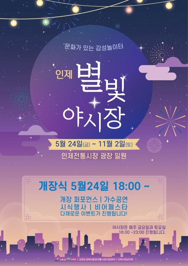 인제 별빛 야시장은 이달 24일부터 오는 11월 2일까지 매주 금요일과 토요일 저녁 6시부터 11시까지 인제시장 광장 일원에서 열린다.