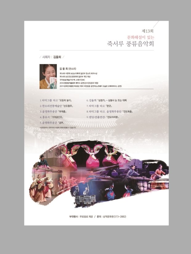 이번「죽서루 풍류음악회」에는 제16회 남도민요경창대회 일반부 개인 대상 등 다수의 수상 경력을 갖고 있으며 각종 국악방송 MC로도 활발하게 활동 중인 국악인 김율희가 사회자로 무대에 오른다.
