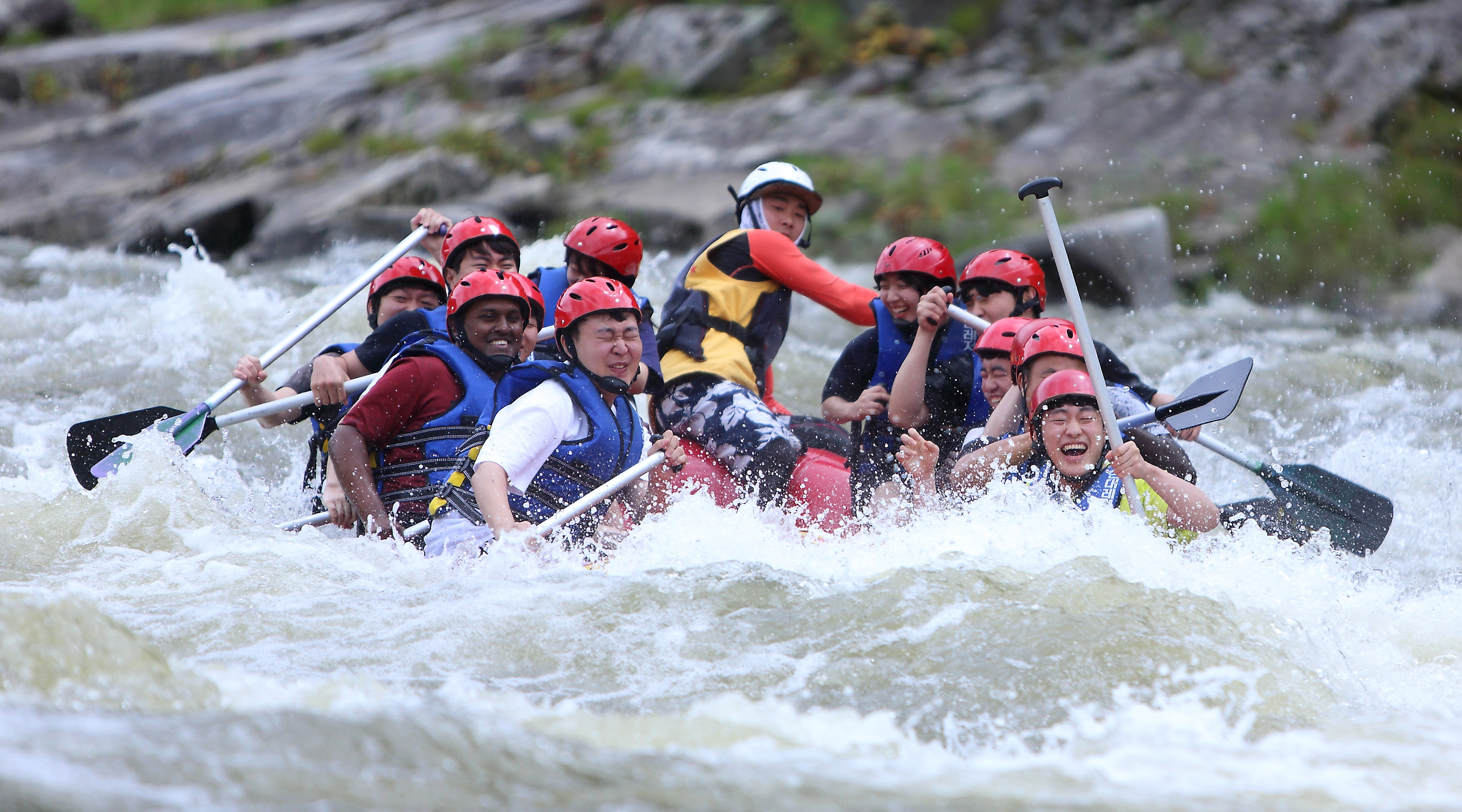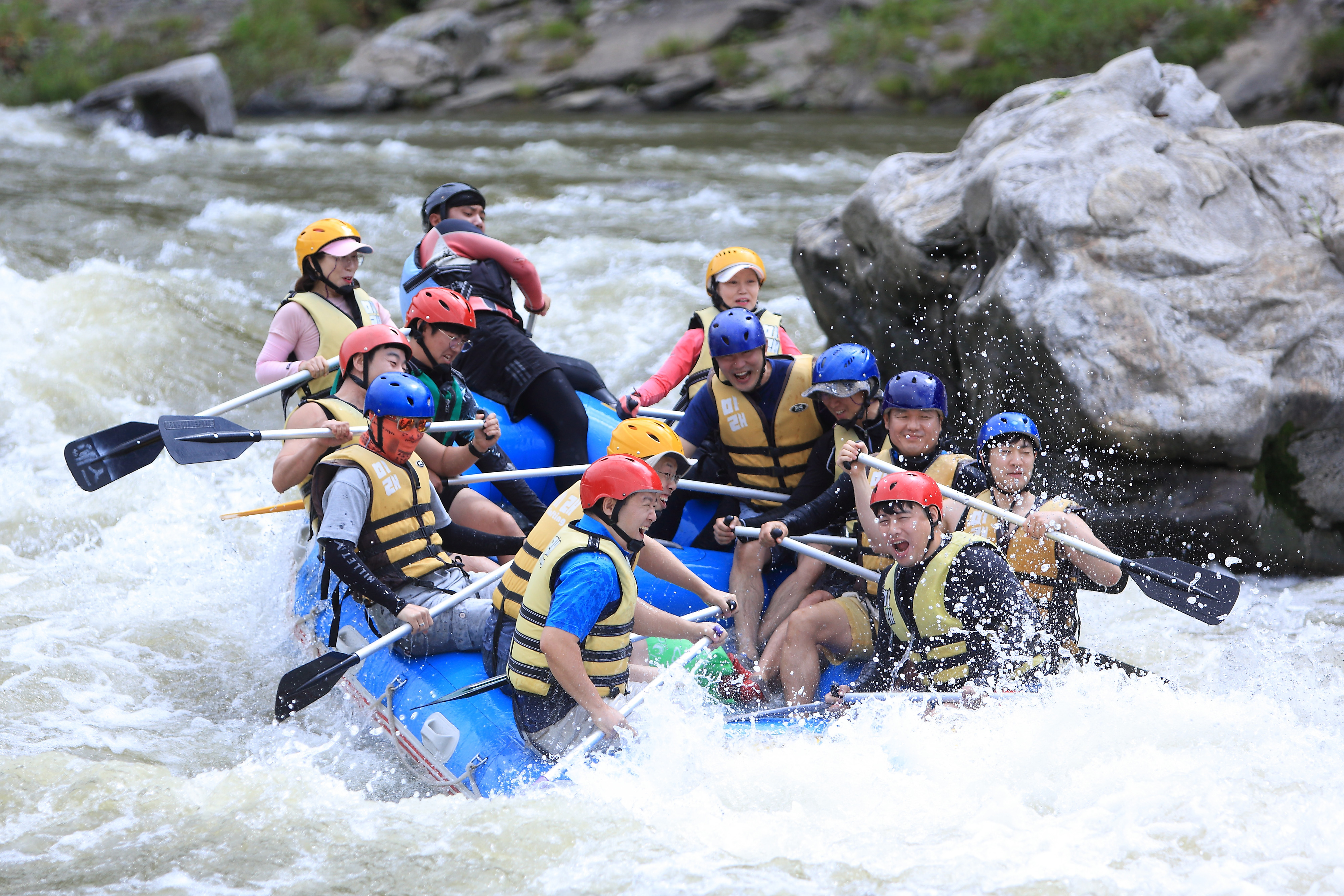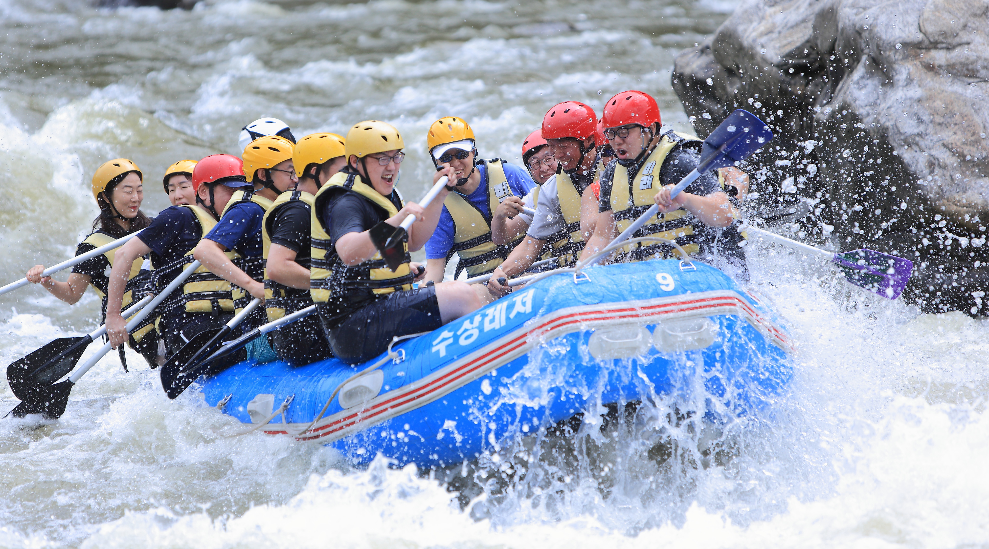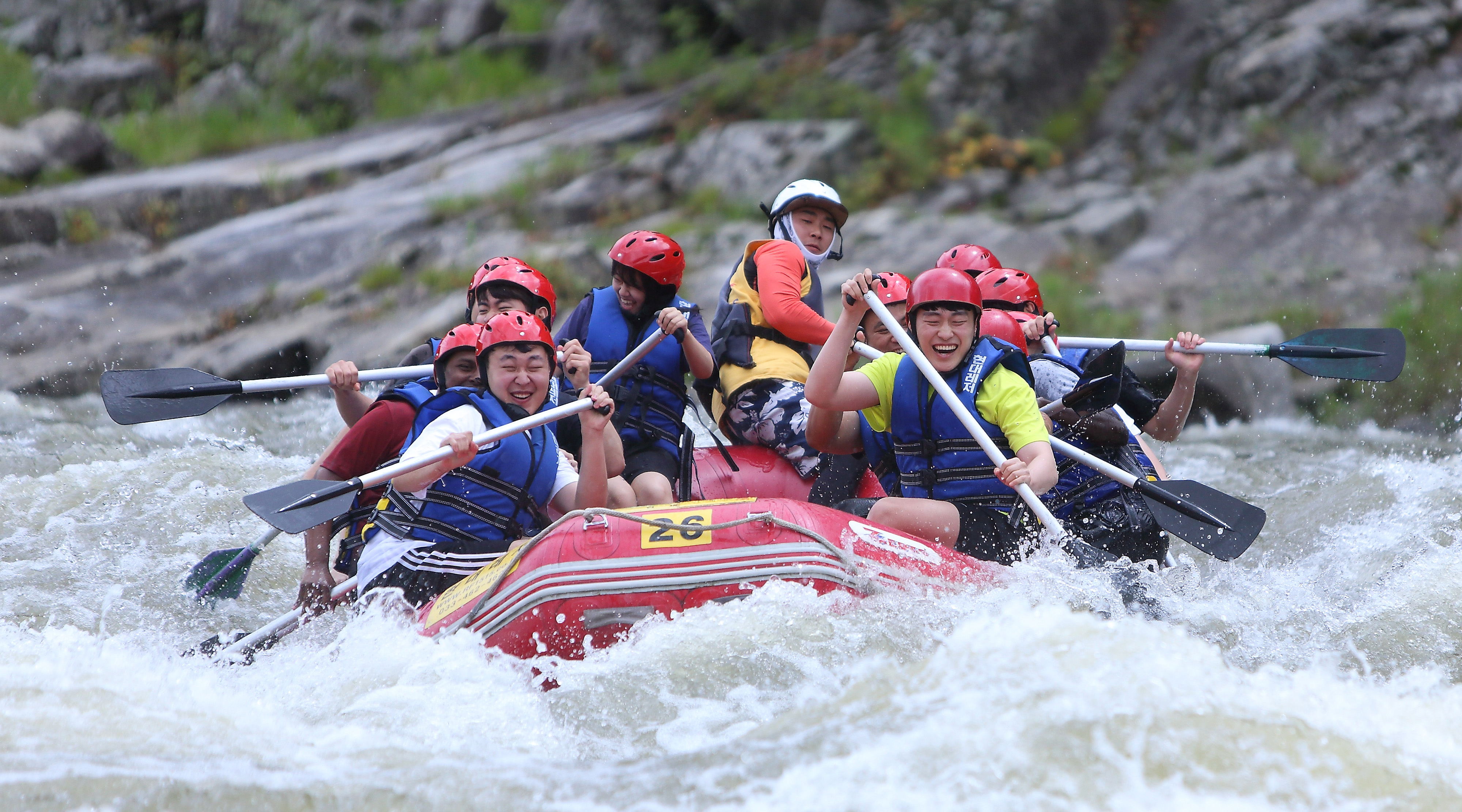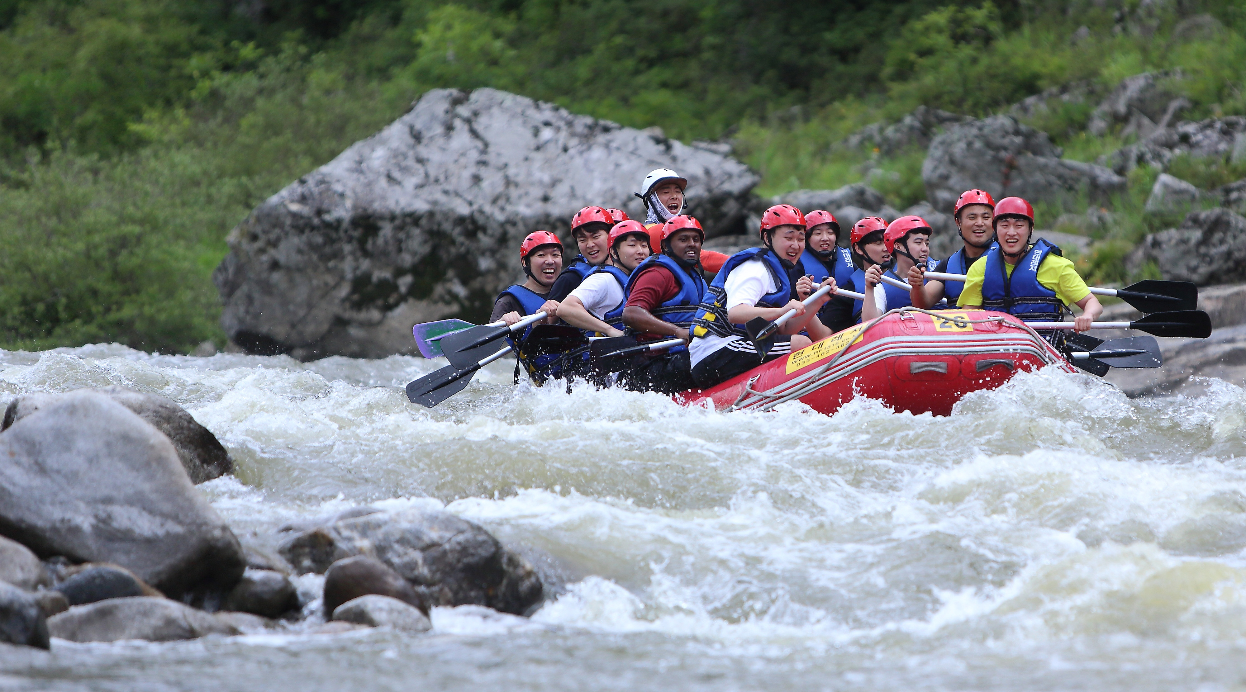 지난 주말인 13일 관광객들이 인제 내린천의 비경과 함께 시원한 물살을 가르며 스릴 만점 래프팅 체험을 즐기고 있다.