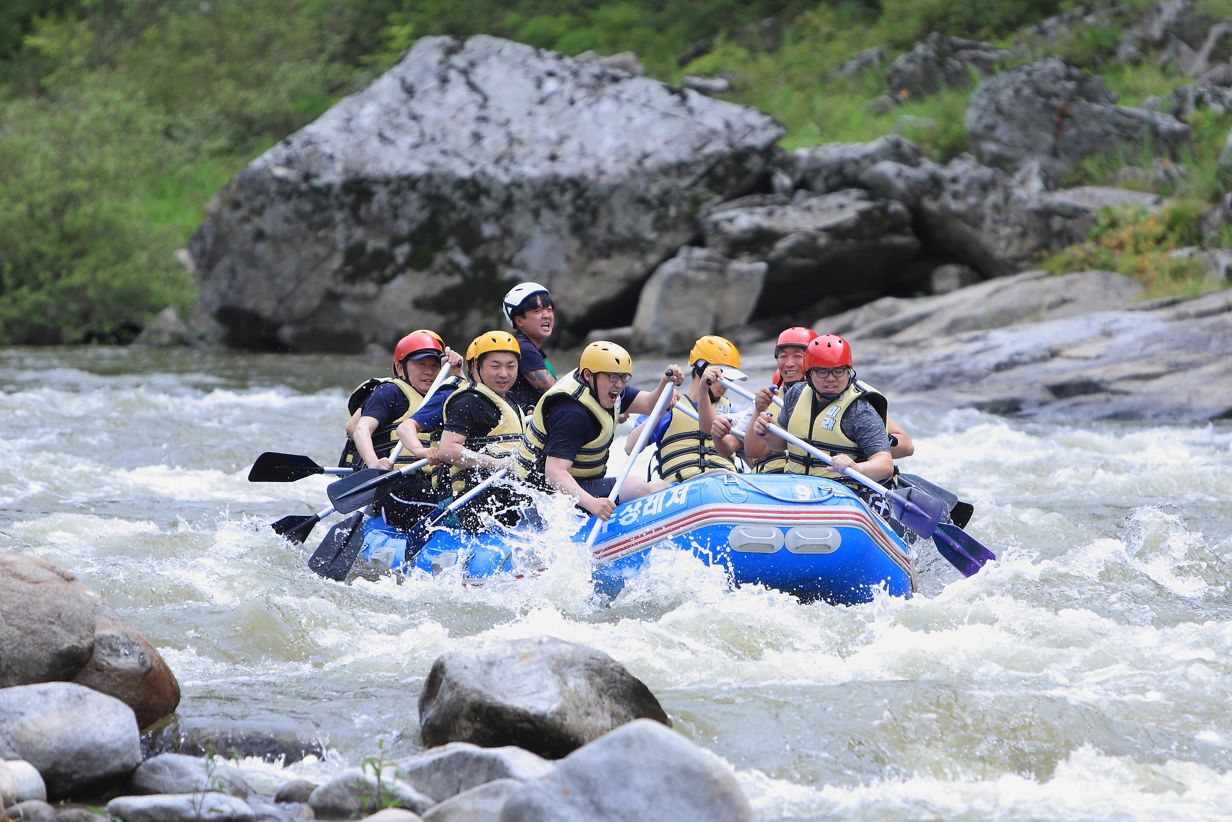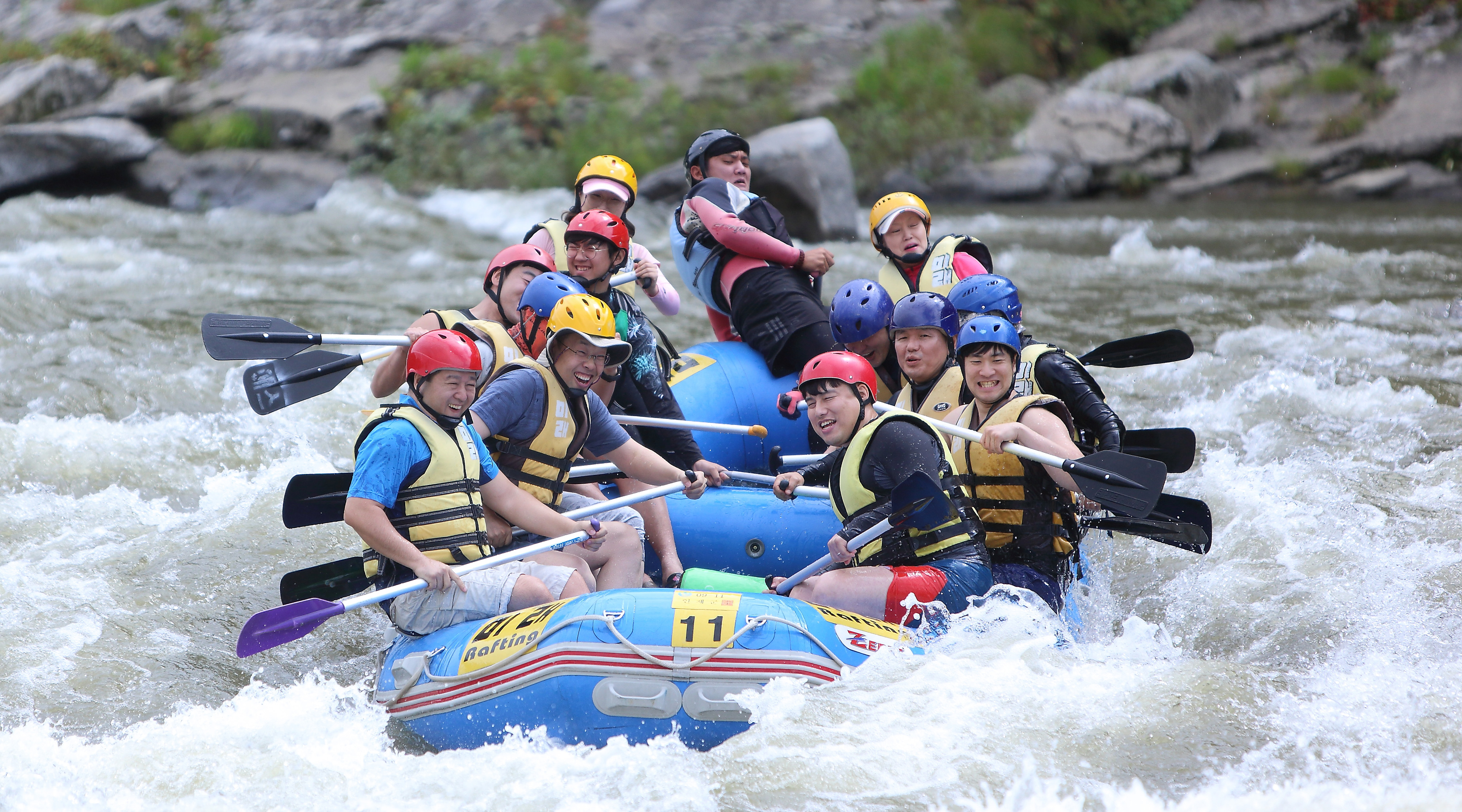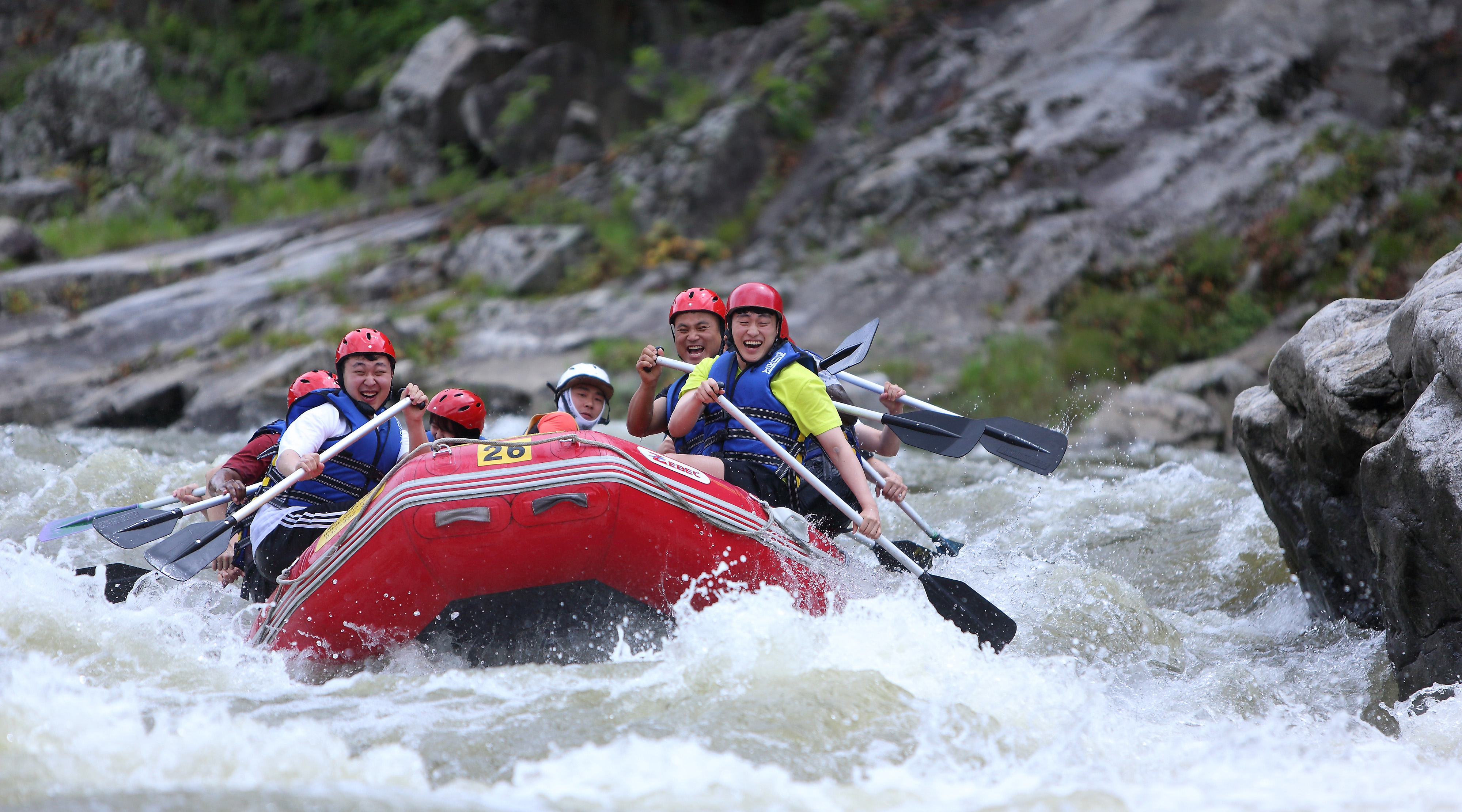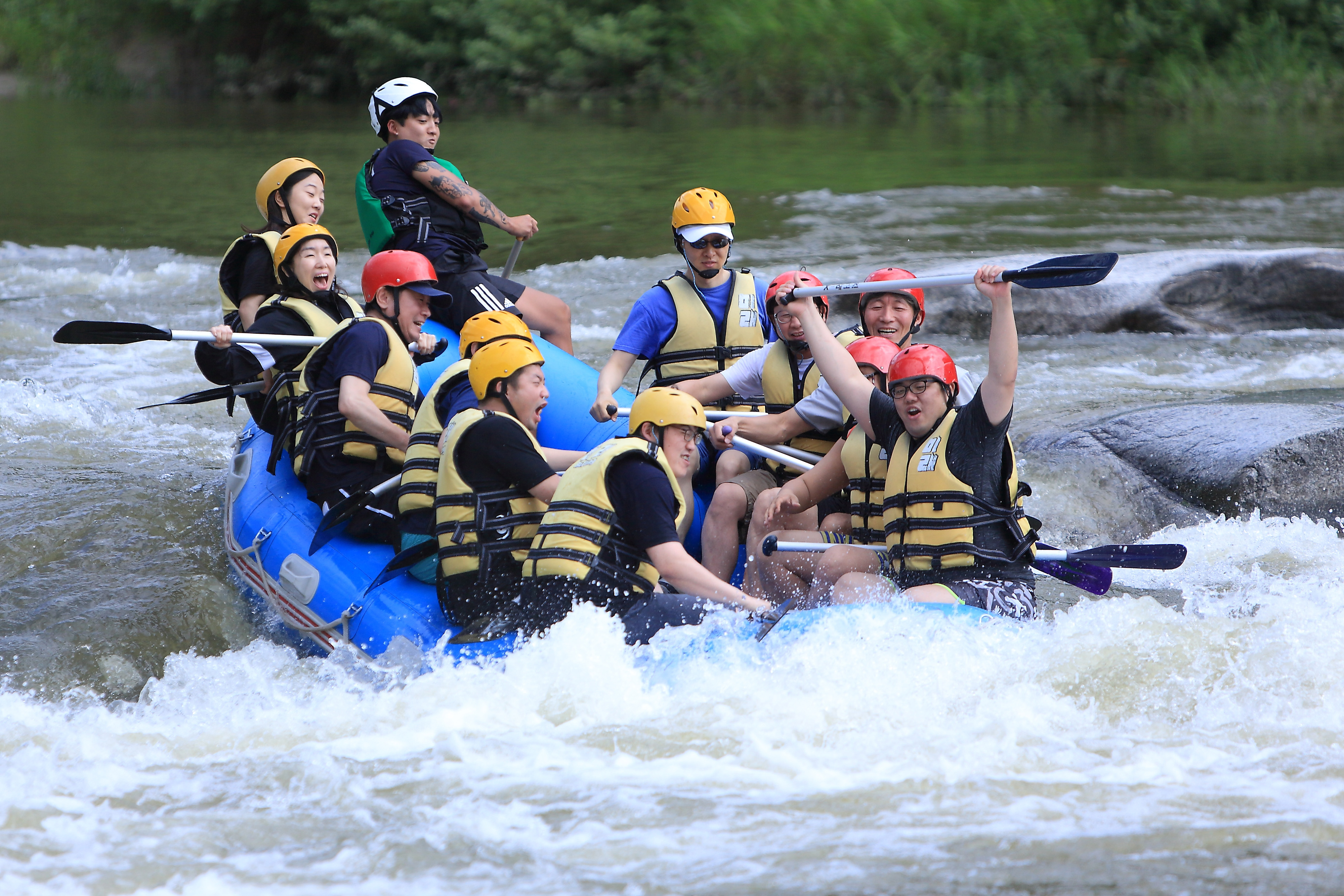 지난 주말인 13일 관광객들이 인제 내린천의 비경과 함께 시원한 물살을 가르며 스릴 만점 래프팅 체험을 즐기고 있다.