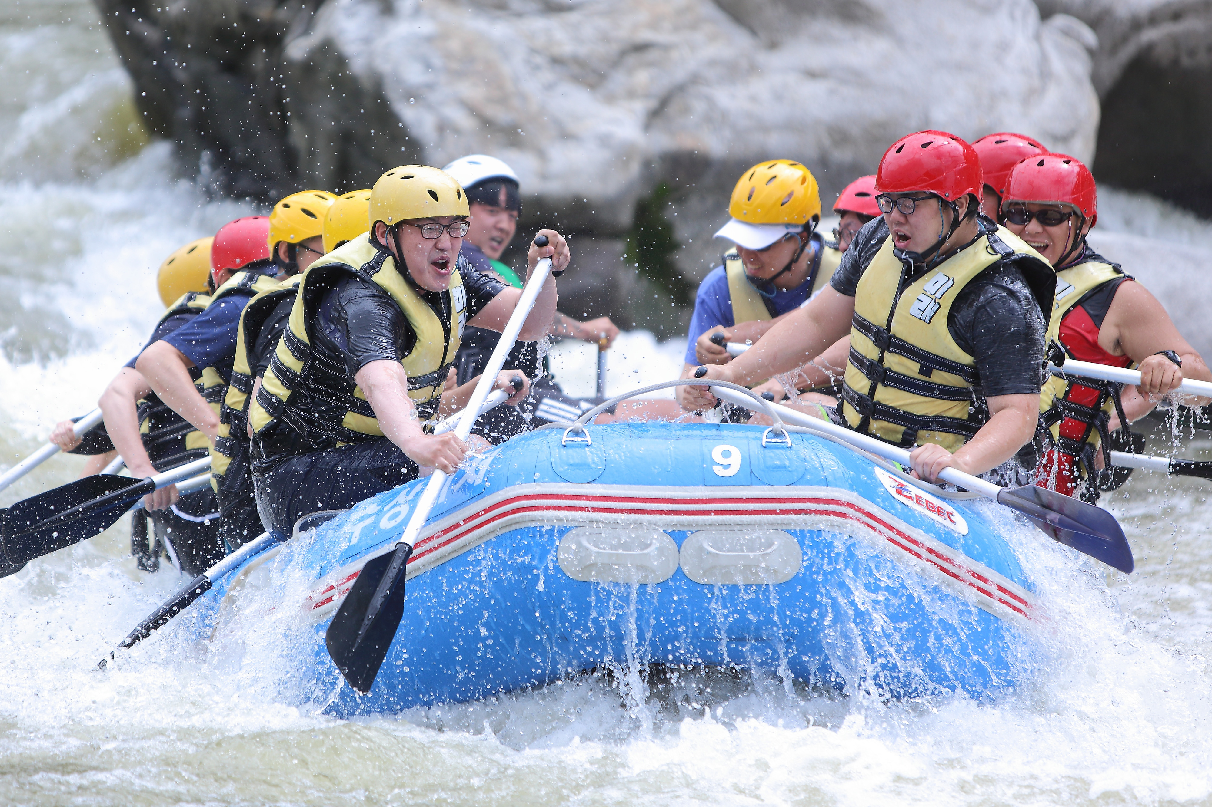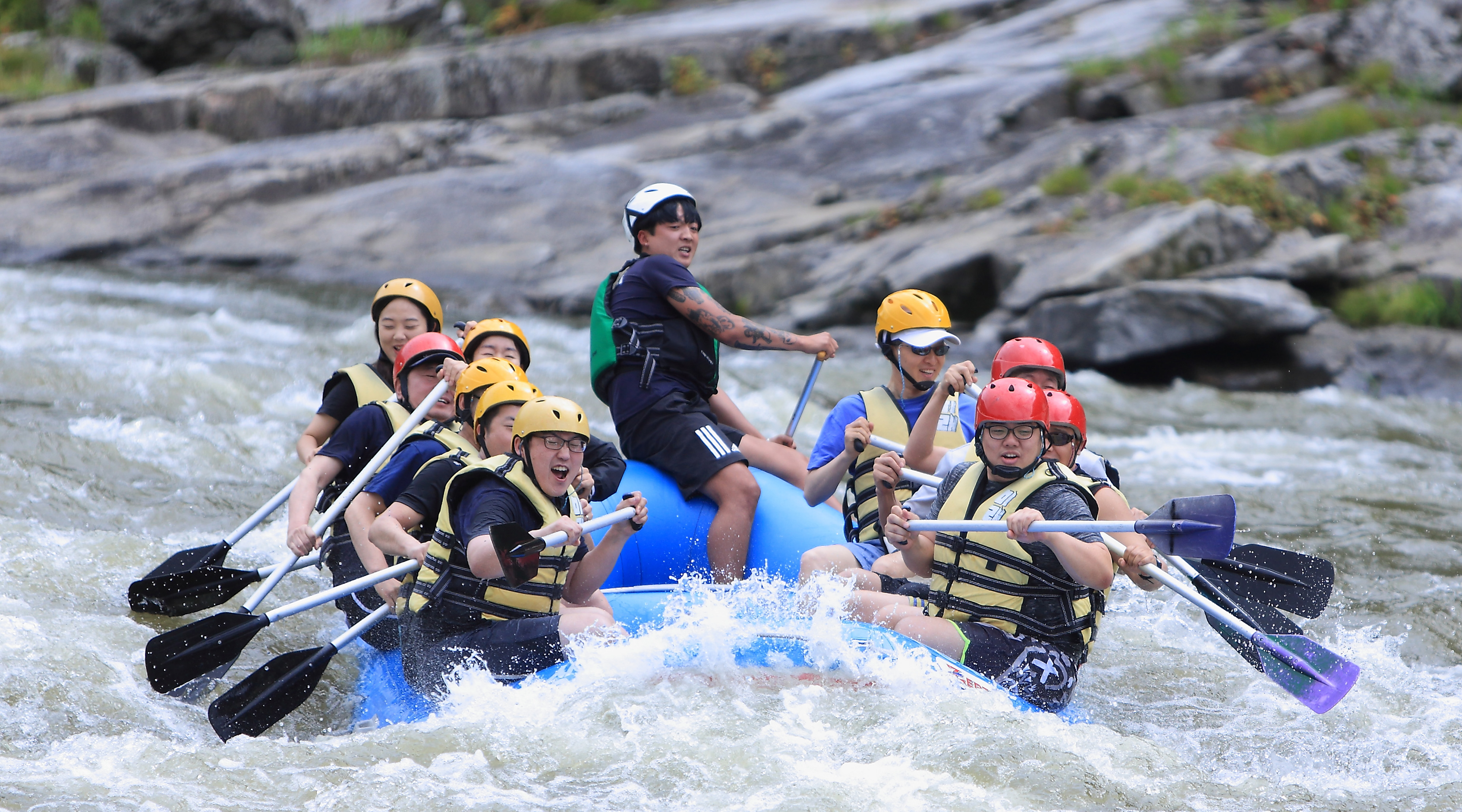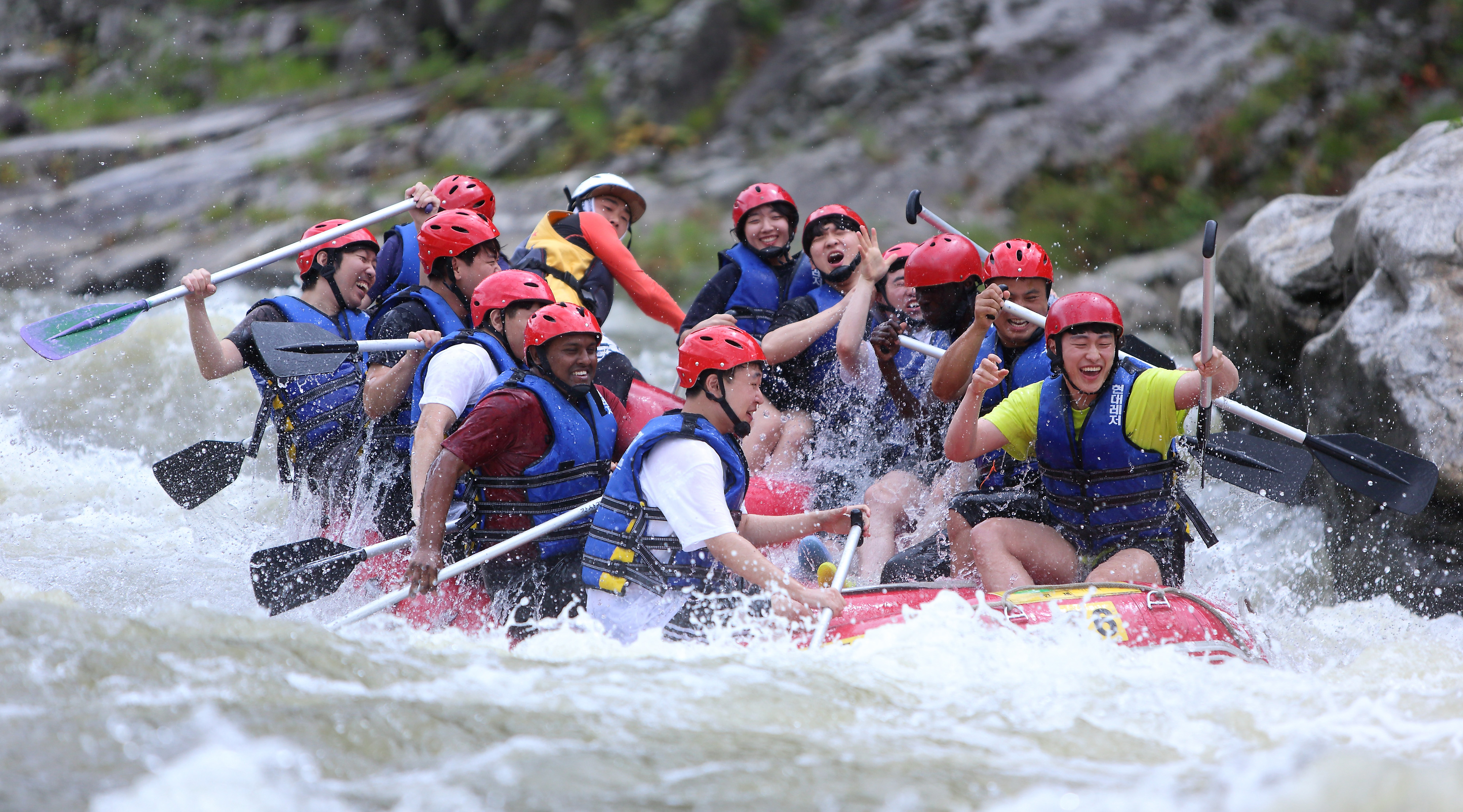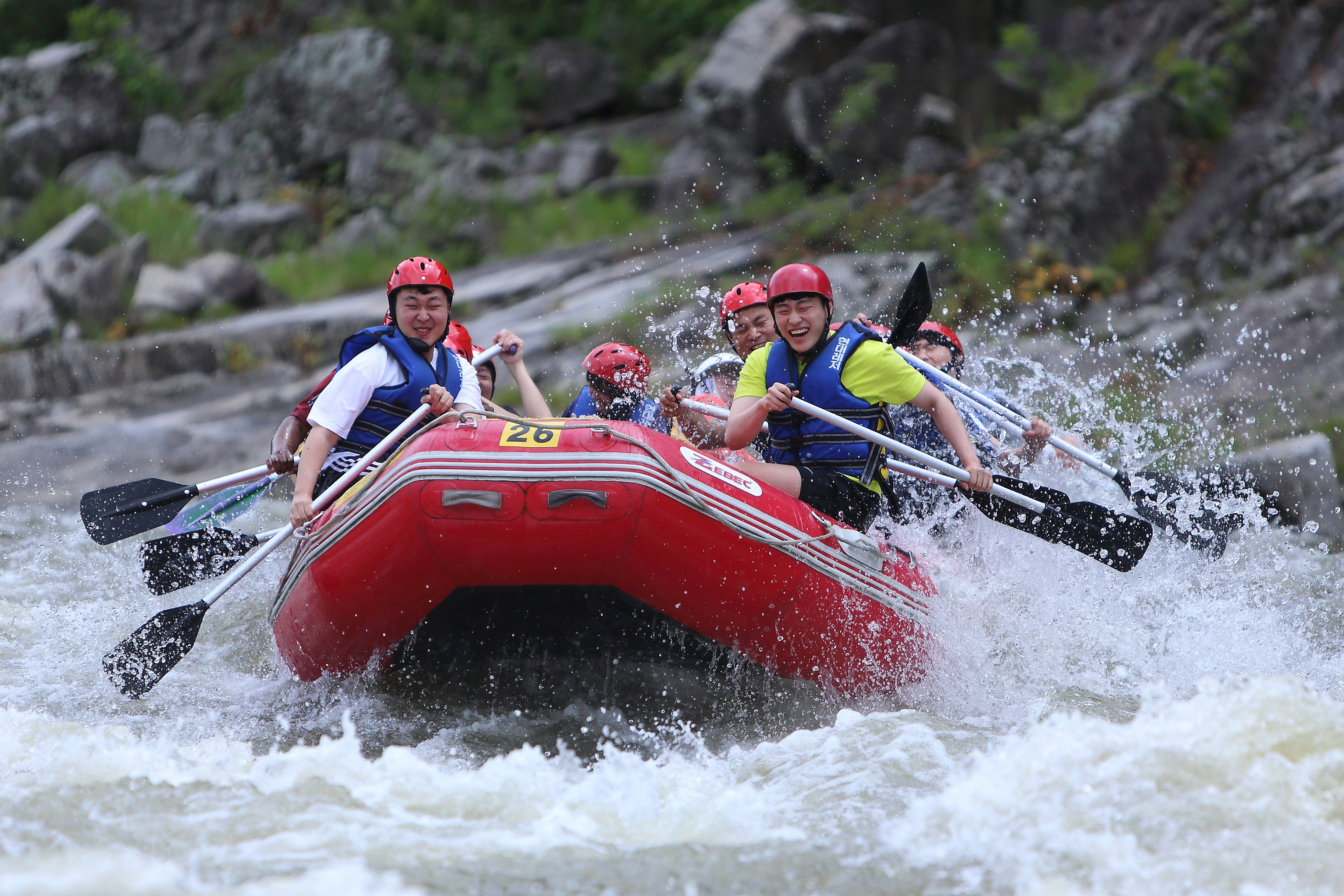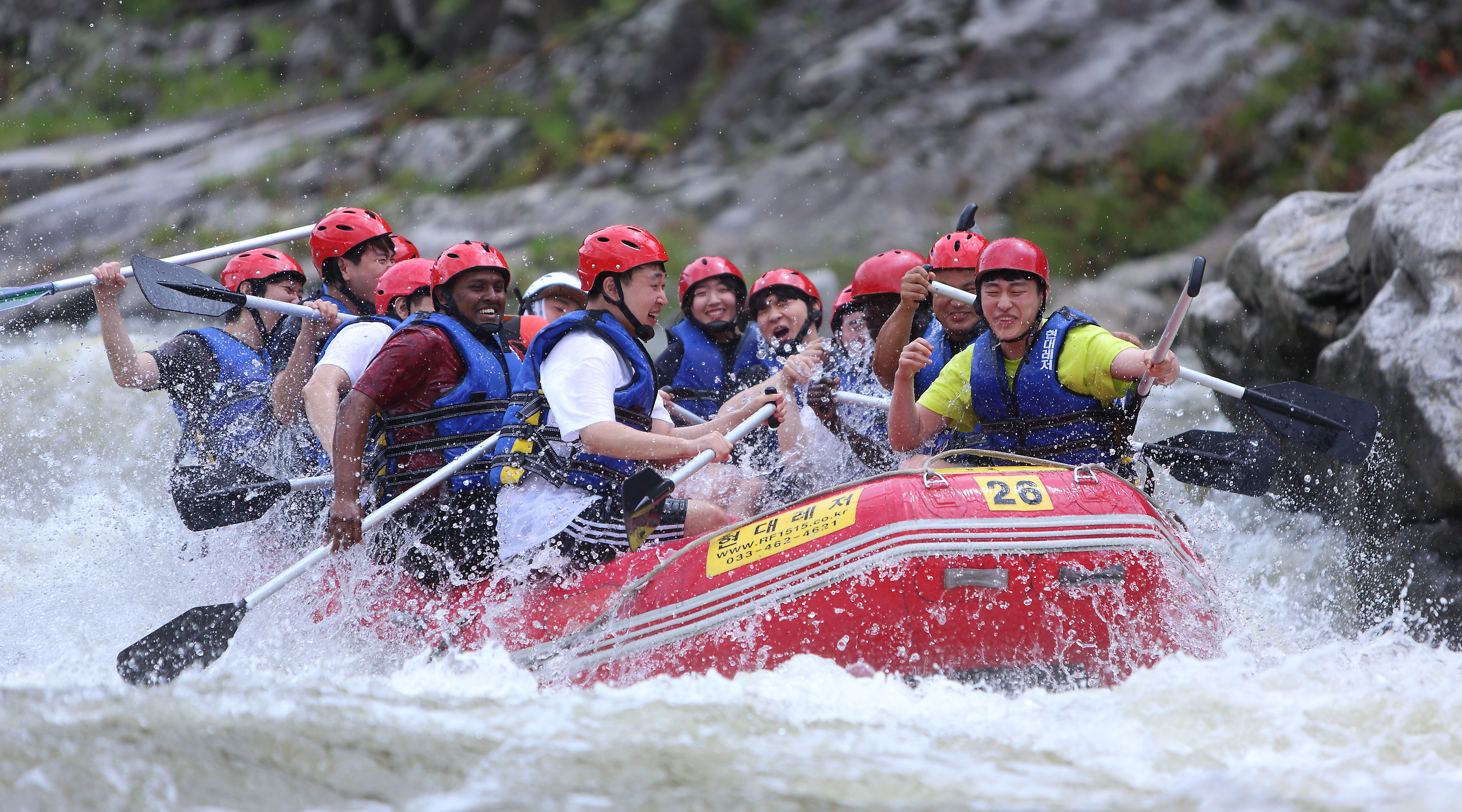지난 주말인 13일 관광객들이 인제 내린천의 비경과 함께 시원한 물살을 가르며 스릴 만점 래프팅 체험을 즐기고 있다.