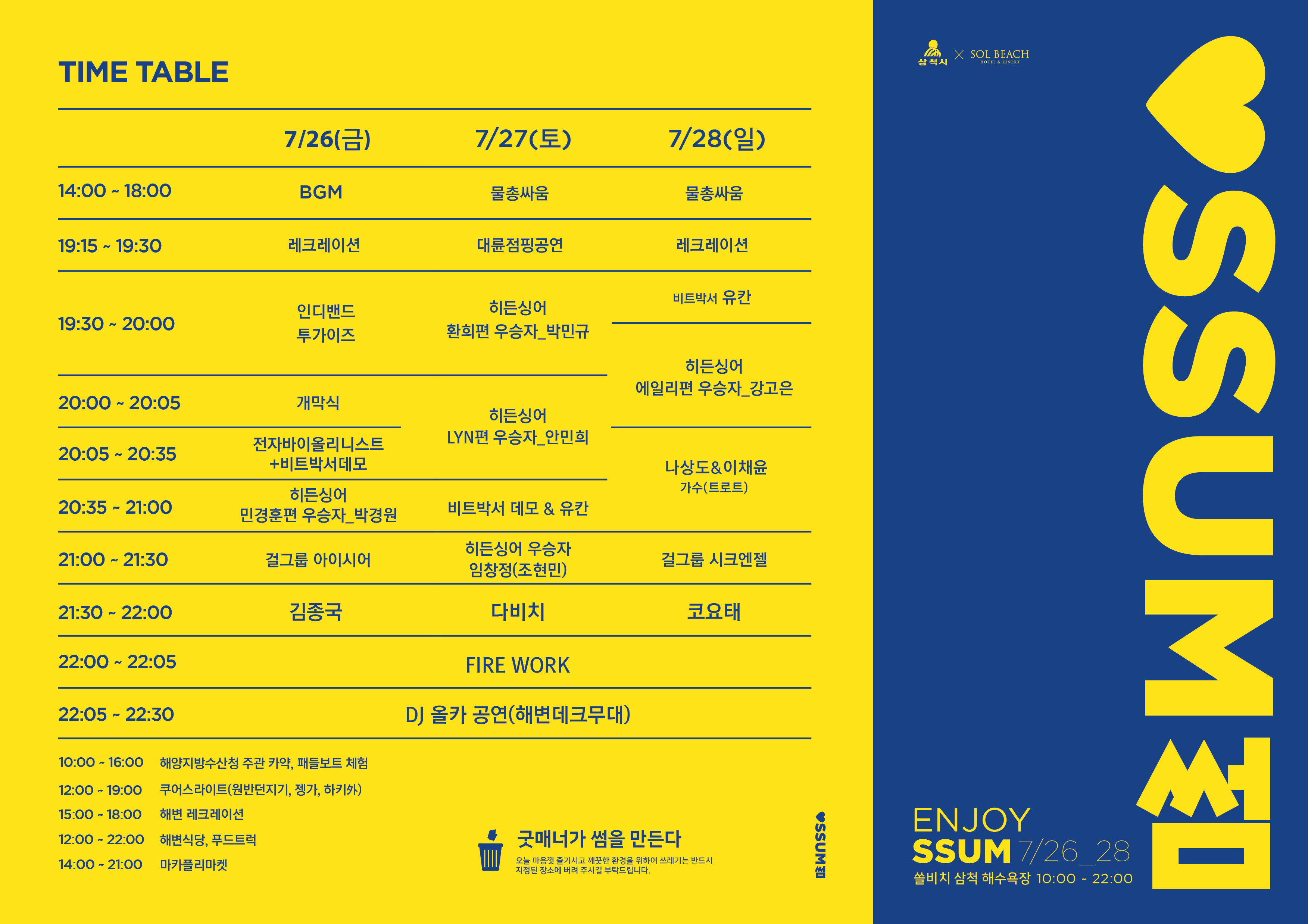 삼척시의 여름 대표 축제인 ‘2019 ENJOY 썸 페스티벌’이 오는 7월 26일(금)부터 28일(일)까지 3일간 삼척해수욕장 일대에서 열린다.