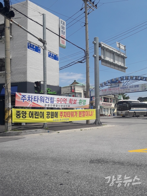 강릉시가 주문진 전통시장 부근의 교통혼잡 문제를 해결하기 위해 중앙공원(구읍사무소 근처)을 400대 수용 규모의 주차타워로 만들겠다는 계획을 추진한다는 사실이 알려진 지난 12일부터 시내 곳곳에 현수막이 걸리기 시작했다.