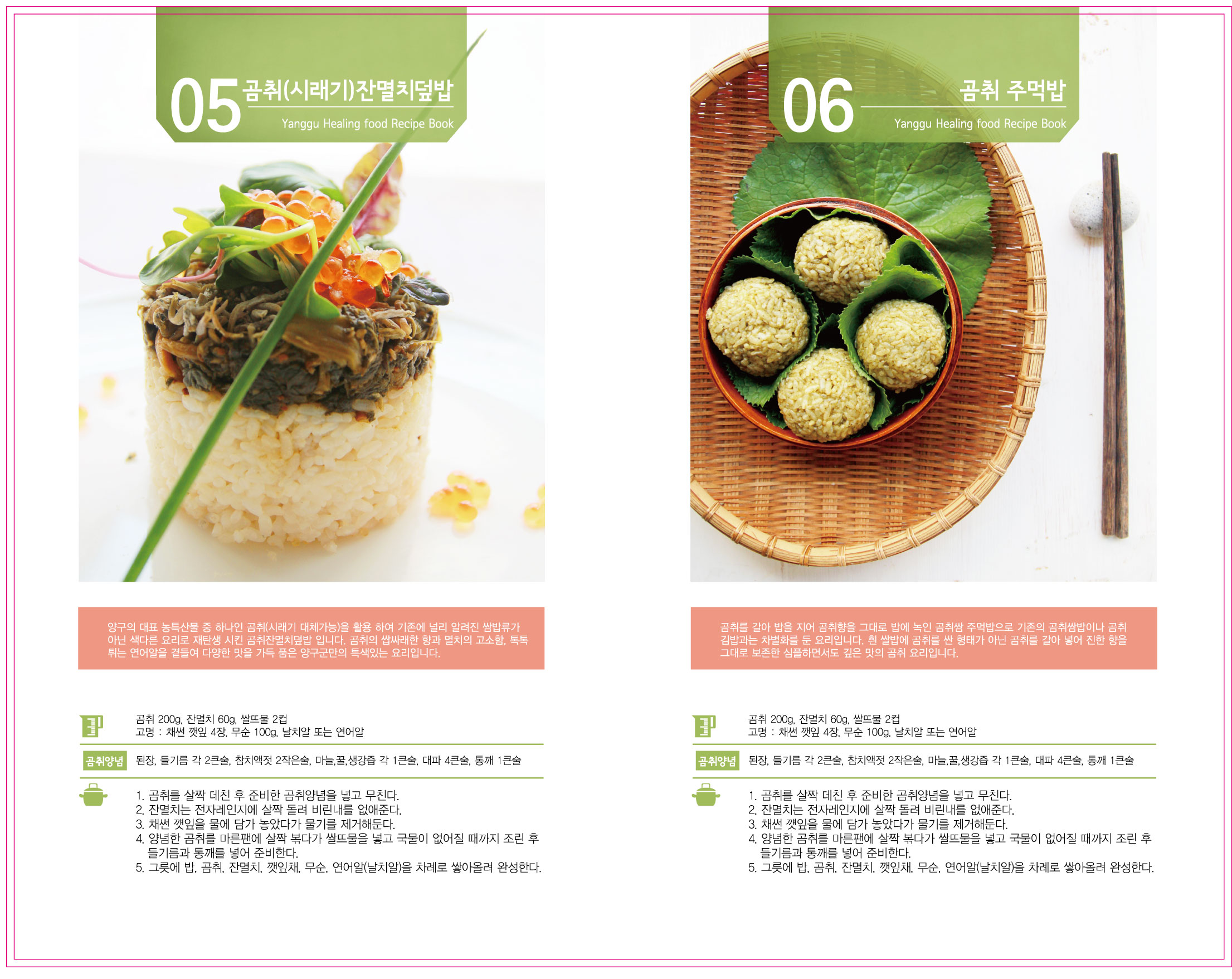지난 2월부터 시작된 국토정중앙 힐링푸드 개발 용역은 먼저 양구군의 농·특산물 현황을 파악한 후 양구 산 농·특산물의 활용도 및 보급화 가능성이 높은 새 메뉴 개발에 나서 지금까지 5회의 레시피 개발 보고와 2회(5월 15일, 6월 10일)의 중간보고회를 개최하면서 보완작업을 거듭해왔으며, 최종 보고회에 맞춰 레시피 북을 발간했다.