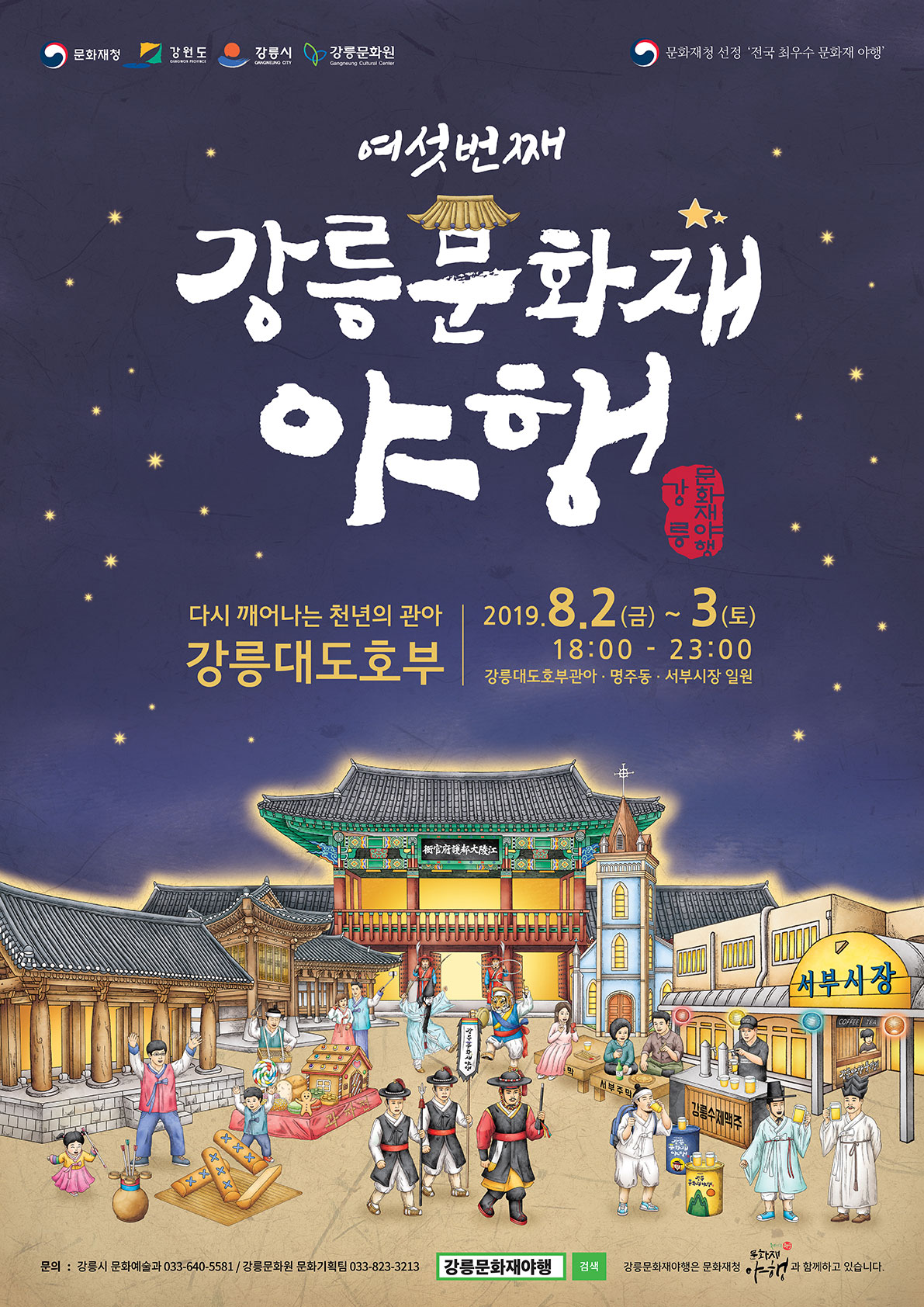 8월2일(금)부터 8월3일(토)까지 이틀간 강릉대도호부, 명주동, 서부시장 에서는 「여섯번째 강릉문화재 야행」이 개최된다.