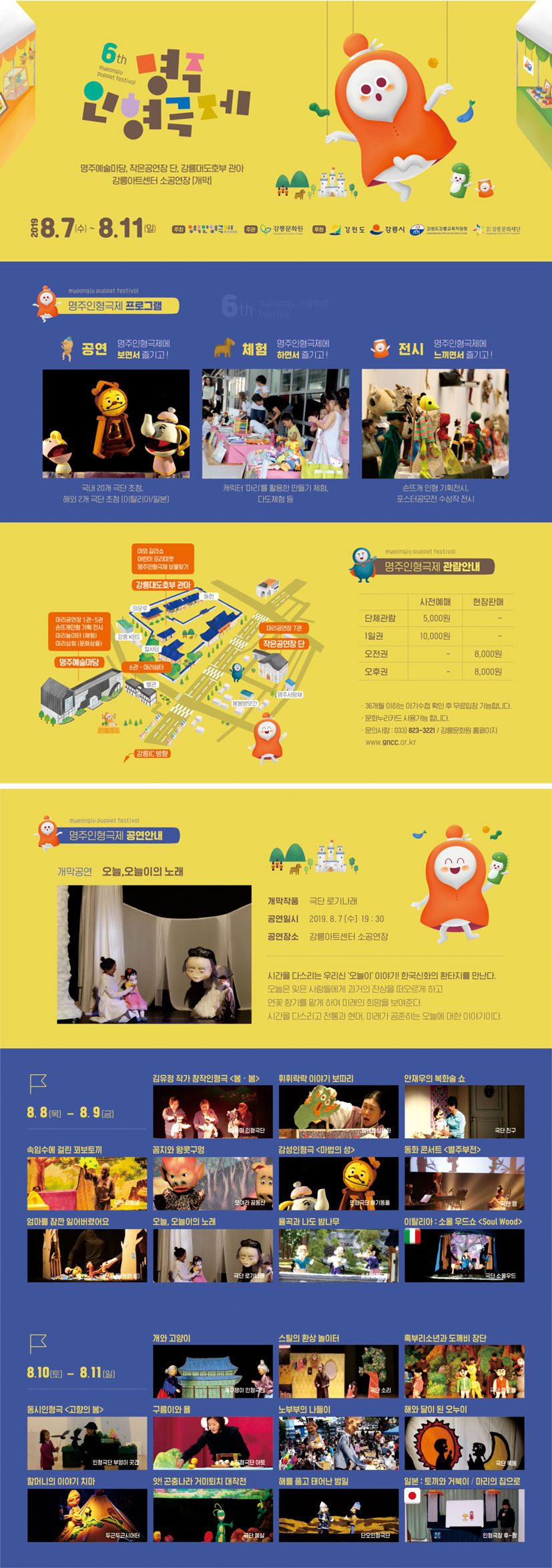 8월7일(수)부터 8월11일(일)까지 5일간 명주예술마당, 작은공연장 단, 강릉대도호부관아 에서는 「제6회 명주인형극제」가 개최된다.