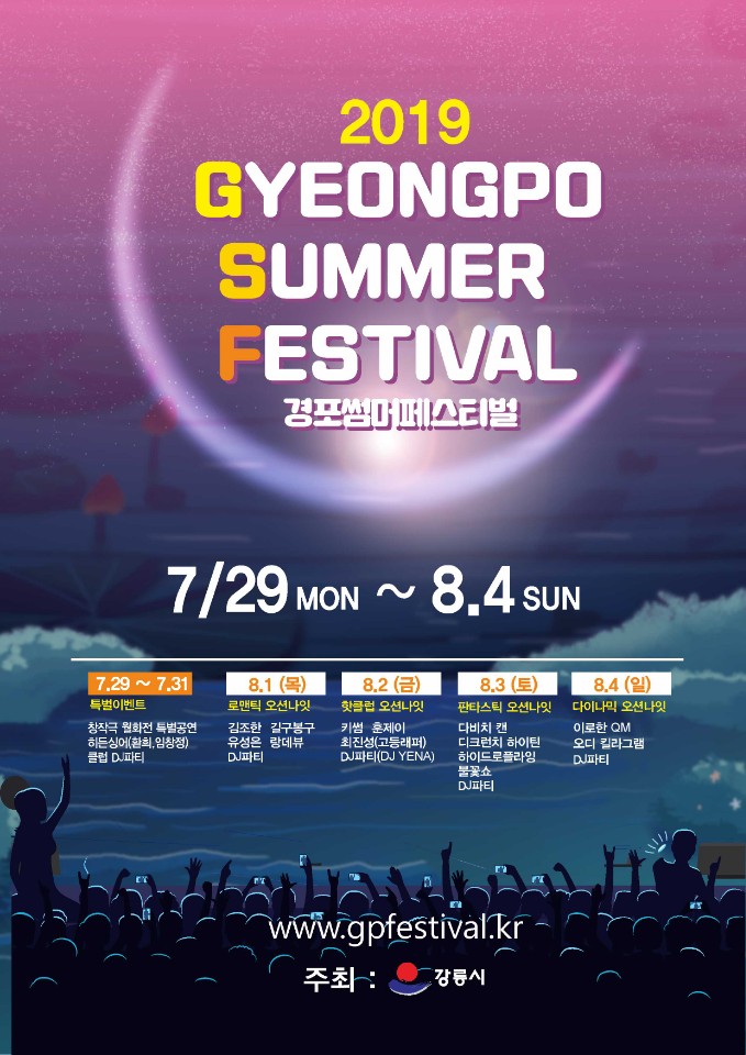 먼저 푸른 동해바다 새하얀 백사장에서 펼쳐지는 7일간의 축제 ‘2019 경포썸머페스티벌’이 7월 29일부터 8월 4일까지 매일 저녁 7시부터 경포해수욕장 중앙백사장 특설무대에서 열린다.