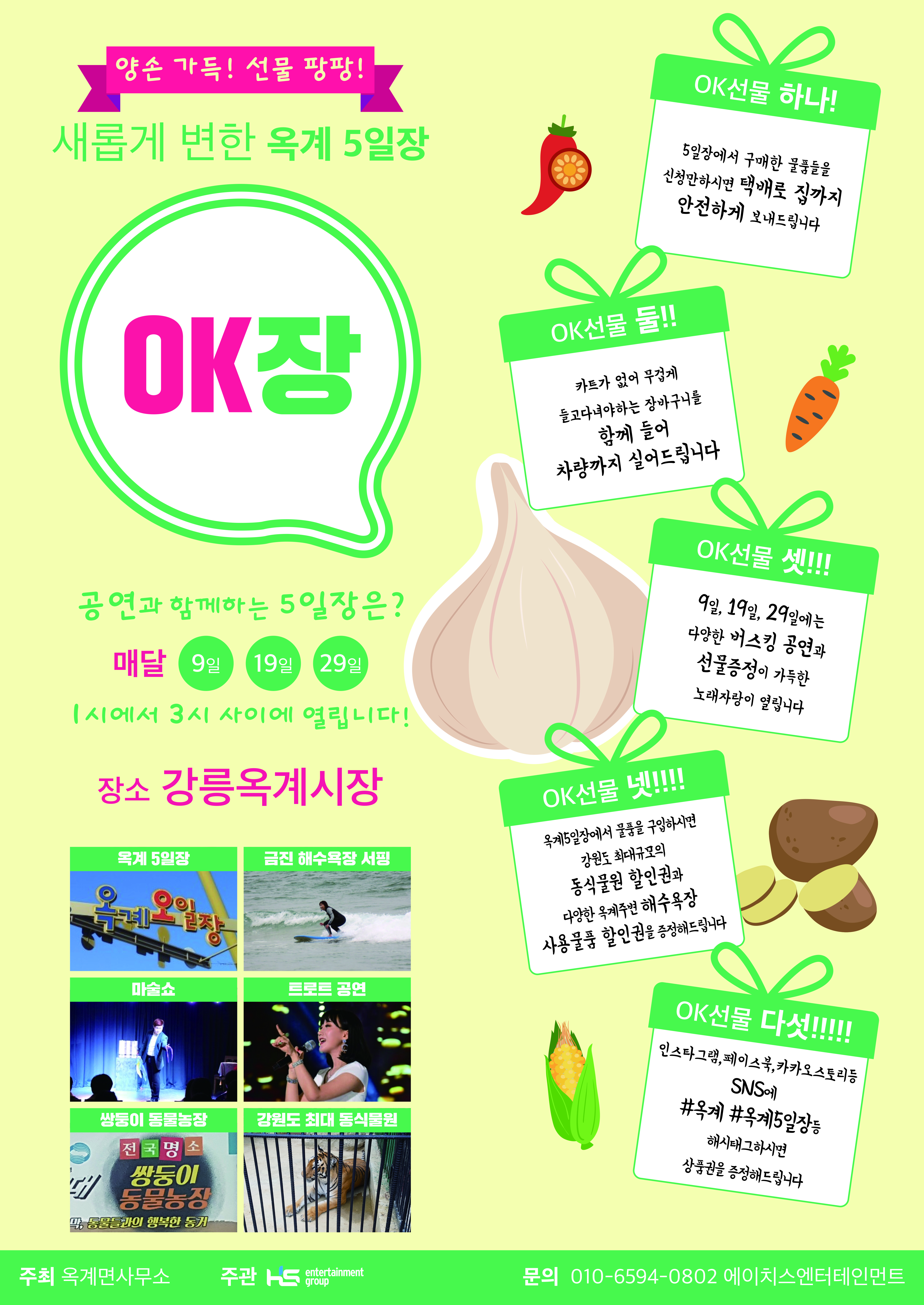 강릉시 유일한 전통5일장인 옥계전통시장이 젊은 피를 수혈해 새로운 모습으로 손님맞이에 나선다. 옥계면은 에이치스엔터테인먼트와 합작으로 오는 9일을 시작으로 12월말까지 옥계5일장을 다양한 버스킹 공연과 SNS를 활용하여 ‘문화를 파는 전통시장’으로 변모시킬 예정이라고 밝혔다.