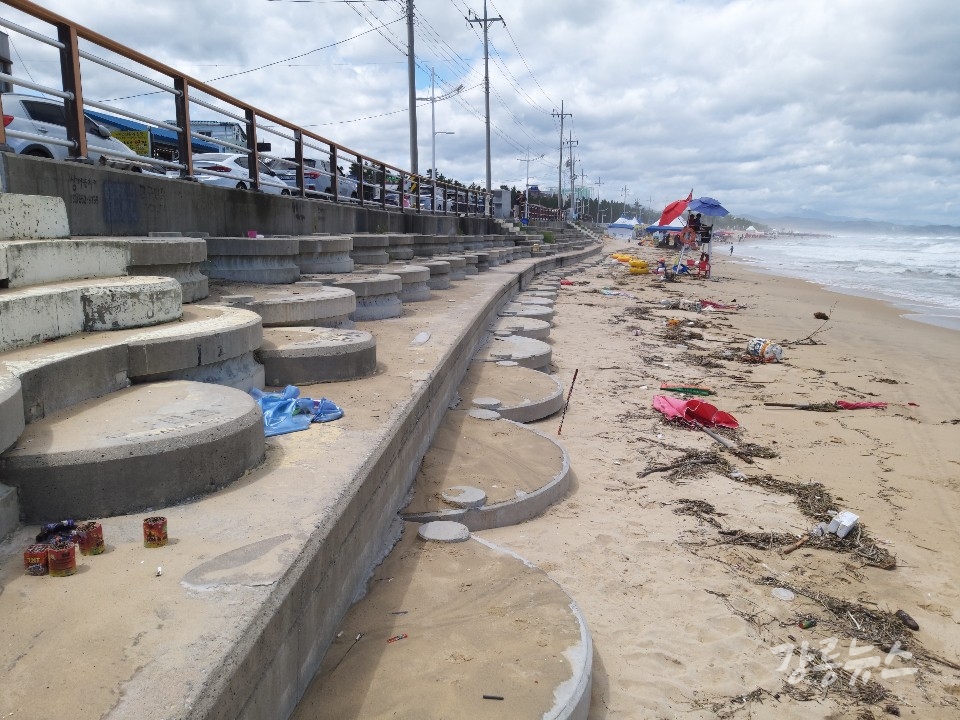 16일 오전, 태풍이 지나간 후 해변으로 쓸려 온 온갖 쓰레기들. 버려진 파라솔부터 시작해서 찢어진 그물, 음료수 플라스틱 용기류가 눈에 많이 띈다. 최근에는 폭죽으로 인한 쓰레기도 늘어나는 추세. 전날 밤 태풍이 불어 왔음에도 불구하고 해변가에서 폭죽을 터뜨린 후 그 쓰레기를 그대로 방치하고 떠난 모습이 그대로 남아있다.