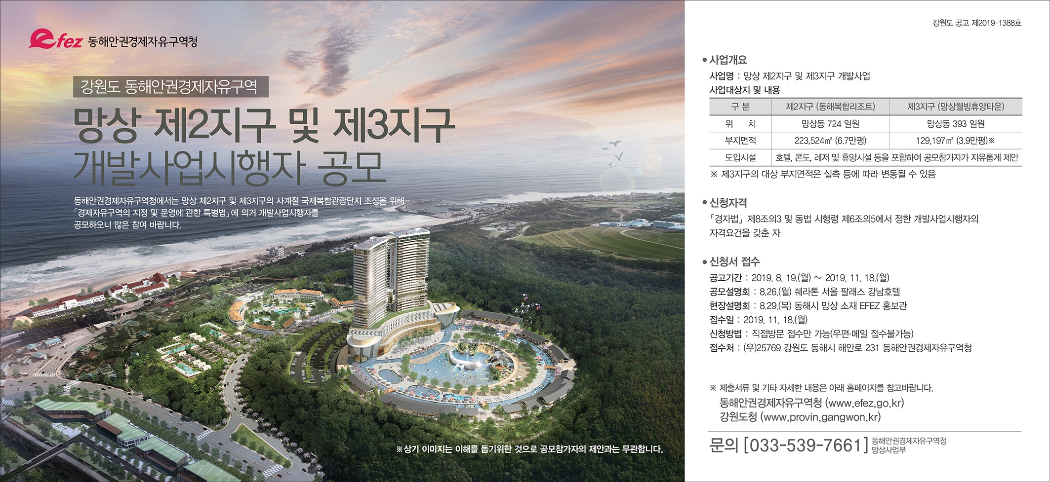 3개월의 공모과정을 거쳐 금년 11.18일(월) 공모접수를 마감할 예정이며, 기타 자세한 사항은 강원도청 및 동해안권경제자유구역청 홈페이지 공고문을 참고하면 되며, 궁금한 사항은 동해안권경제자유구역청 망상사업부(033-539-7661)로 문의하면 자세한 안내를 받을 수 있다.