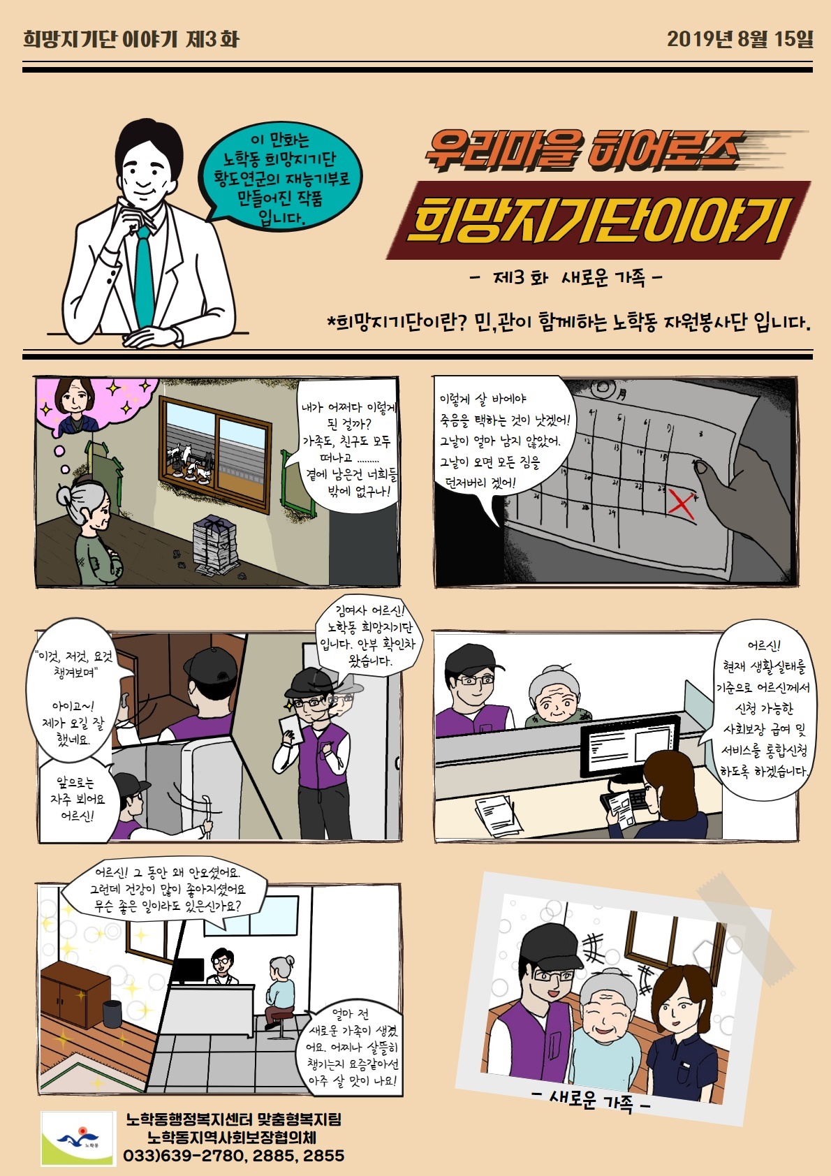 속초시 노학동지역사회보장협의체(위원장 신오일)는 지난 8월 15일(목) 희망지기단 이야기(만화) 제3화「새로운 가족」을 제작 하였다.