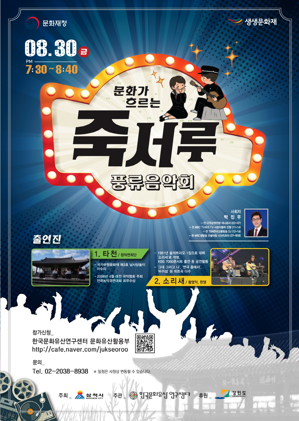 삼척시는 오는 8월 30일(금) 오후 7시 30분 삼척 죽서루에서 문화유산 활용 프로그램‘문화가 흐르는 죽서루 풍류음악회’를 개최한다.