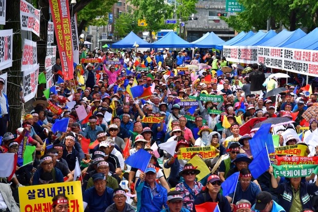 27일 친환경오색케이블카추진위원회 주최로 열린 상경집회에서 참가자들이 케이블카 사업 추진을 촉구하며 삭발식도 진행했다.