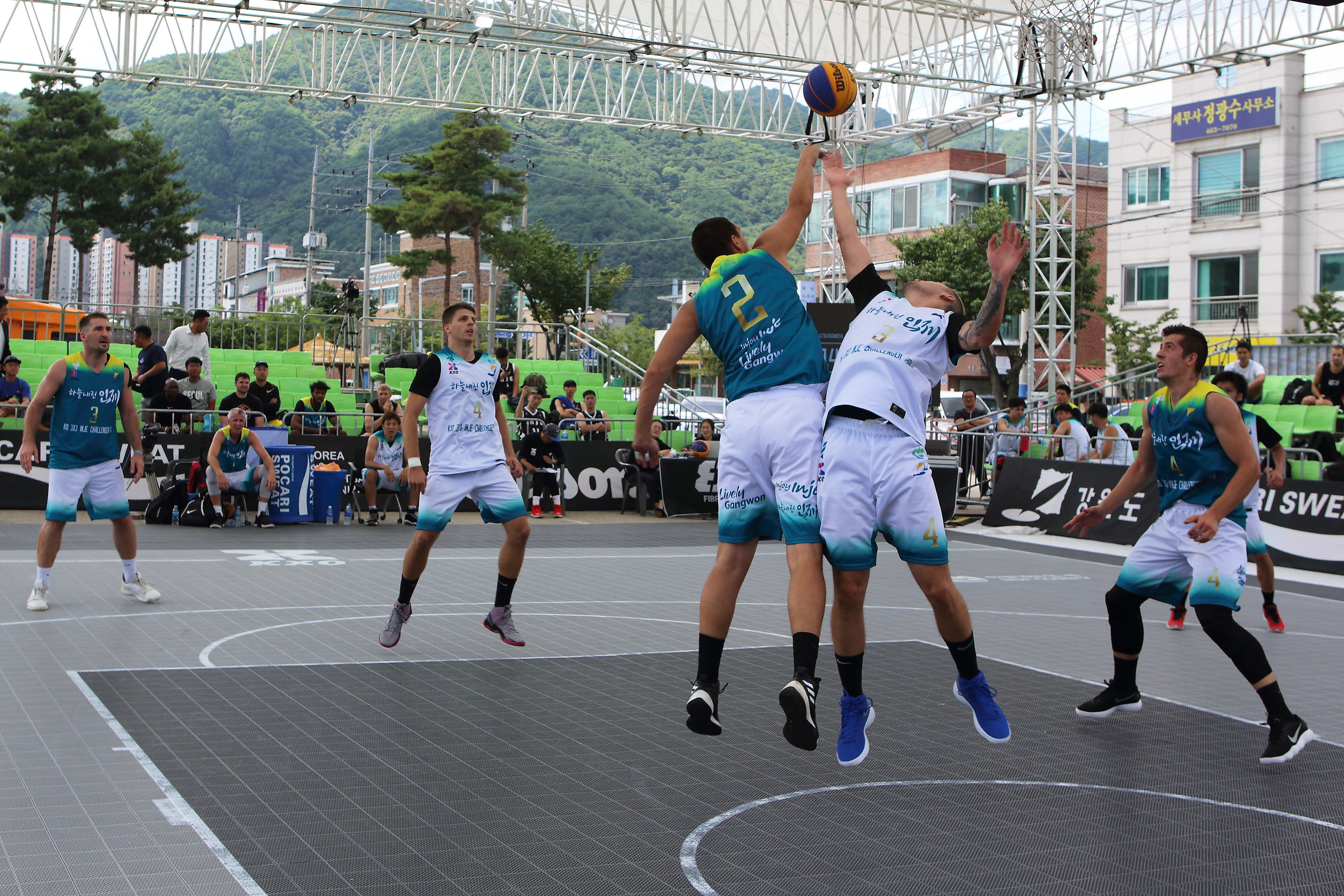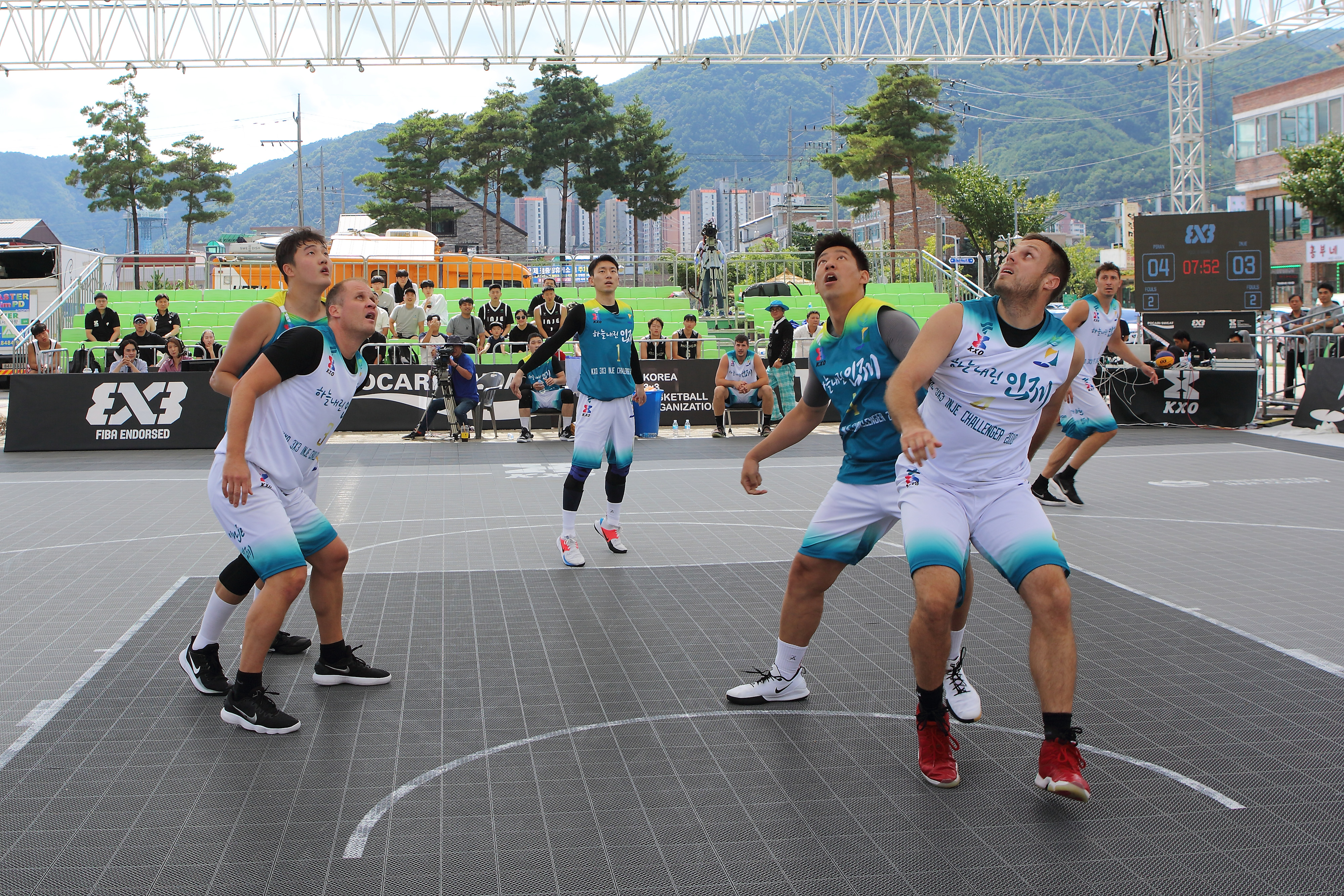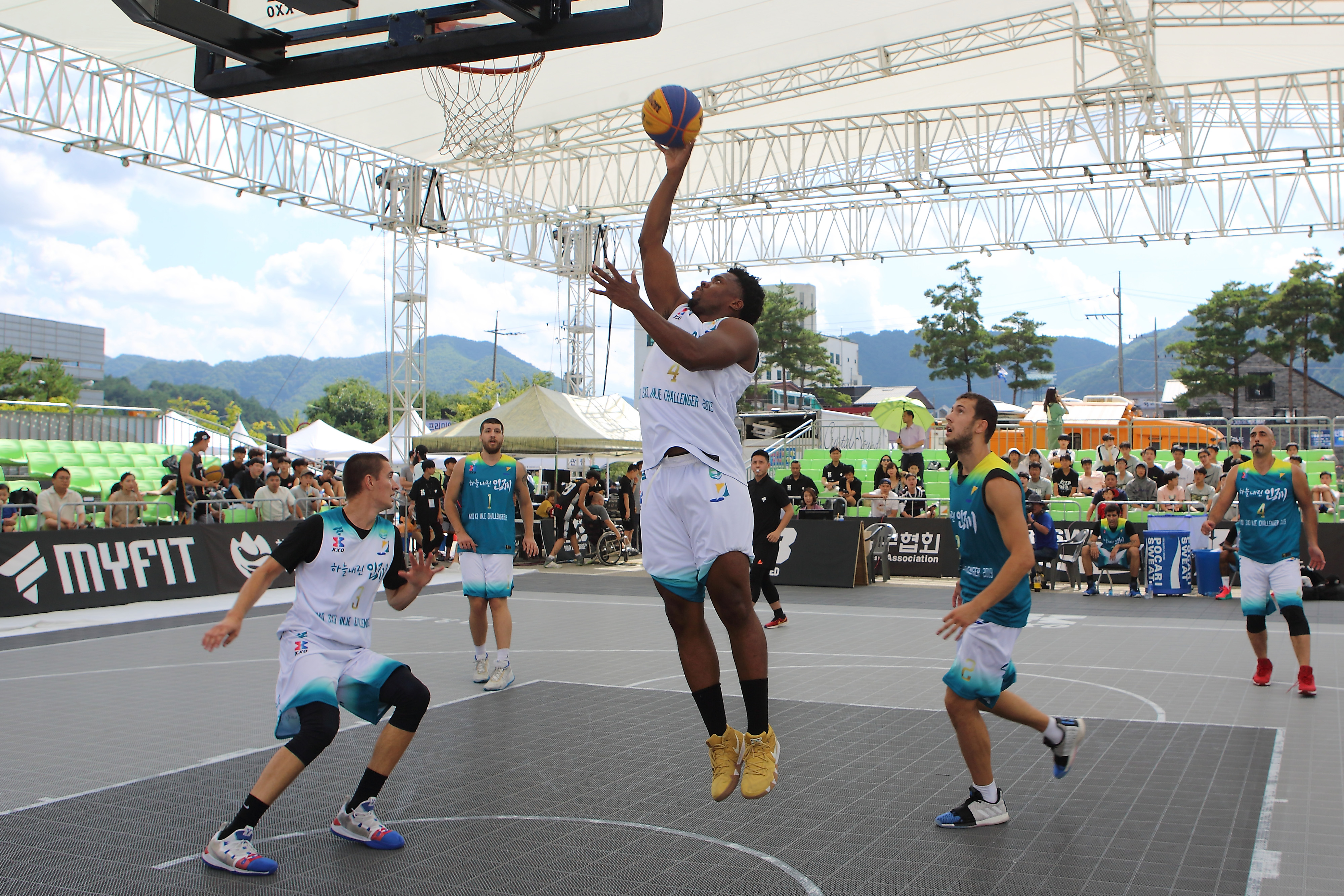 2019 FIBA 3×3 챌린저 국제농구대구회가 지난 31일 인제농특산물판매장 광장 특설코트에서 열려 선수들이 열띤 경쟁을 펼치고 있다.