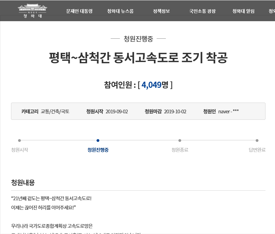 청원 참여는『청와대 홈페이지 → 국민소통광장 → 국민청원 게시판 →‘평택~삼척 동서고속도로 조기 착공’』검색 후 참여할 수 있으며, 기타 문의사항은 기획감사담당관실(☏033-530-2031)로 문의하면 자세하게 안내받을 수 있다.