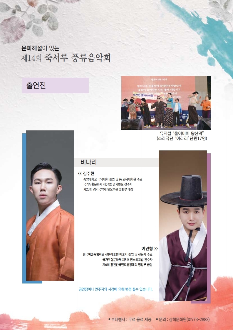이번 음악회는 삼척시가 주최하고 삼척문화원에서 주관하며, 죽서루 경내에서 판소리, 뮤지컬 등 다채로운 문화공연을 선보인다.