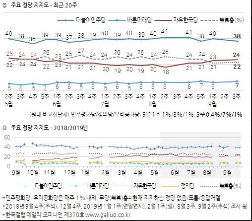 2019년 9월 셋째 주(17~19일) 현재 지지하는 정당은 더불어민주당 38%, 자유한국당 24%, 지지정당이 없는 무당(無黨)층 22%, 바른미래당과 정의당 각각 7%, 우리공화당 1%, 민주평화당 0.4% 순이다. 추석 전인 9월 첫째 주와 비교하면 더불어민주당과 정의당이 각각 2%포인트, 1%포인트 하락했고, 자유한국당과 바른미래당은 1%포인트씩 상승했다.