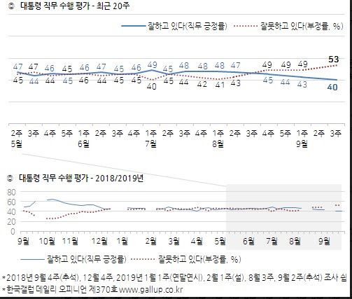 한국갤럽이 2019년 9월 셋째 주(17~19일) 전국 성인 1,000명에게 문재인 대통령이 대통령으로서의 직무를 잘 수행하고 있다고 보는지 잘못 수행하고 있다고 보는지 물은 결과, 40%가 긍정 평가했고 53%는 부정 평가했으며 7%는 의견을 유보했다(어느 쪽도 아님 3%, 모름/응답거절 4%).
