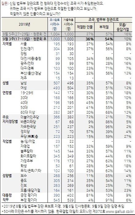 문재인 대통령이 지난 8월 9일 조국 전 청와대 민정수석을 신임 법무부 장관 후보로 지명했고, 9월 6일 인사청문회를 거쳐 9일 장관으로 임명·취임했다. 그러나 후보 지명 이후 제기된 의혹들에 가열된 여야 공방은 장관 취임 후인 지금까지 이어지고 있으며, 검찰 수사도 진행 중이다. 현시점 조국 장관이 법무부 장관으로 적절한지 물은 결과, 우리 국민의 36%가 '적절하다'고 답했고 54%는 '적절하지 않다'고 봤으며 10%는 의견을 유보했다.