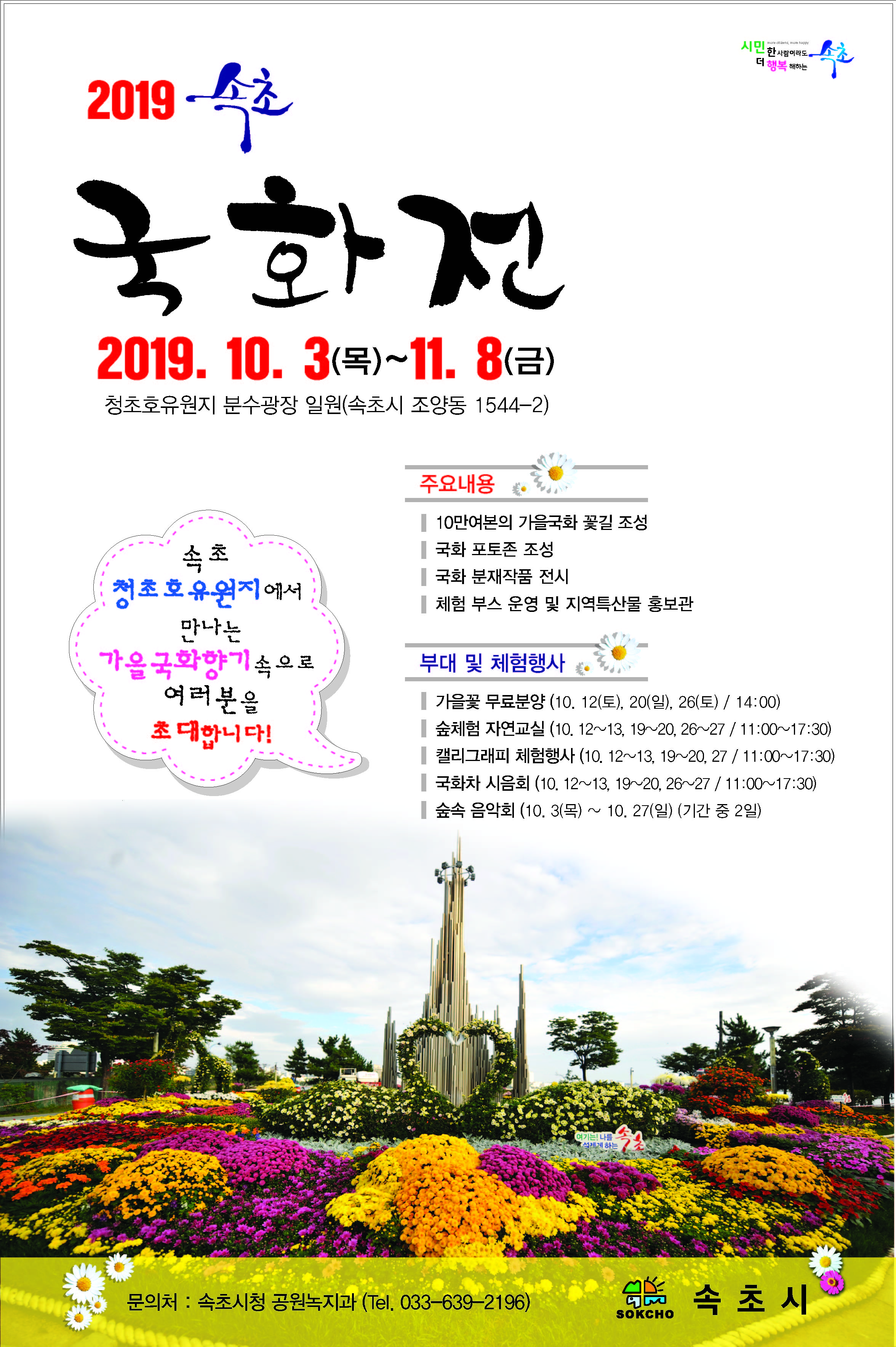 이에, 시는 2019년 속초 국화전 행사 개최를 위하여 지난 9월 24일부터 시 직영으로 청초호유원지 일원에서 꽃식재 등 행사 준비를 하고 있으며, 이밖에도 아름다운 도시경관을 위하여 속초시 전역에 걸쳐 원형화분 및 꽃걸이, 척산온천 가로화단에 가을꽃을 식재한다.