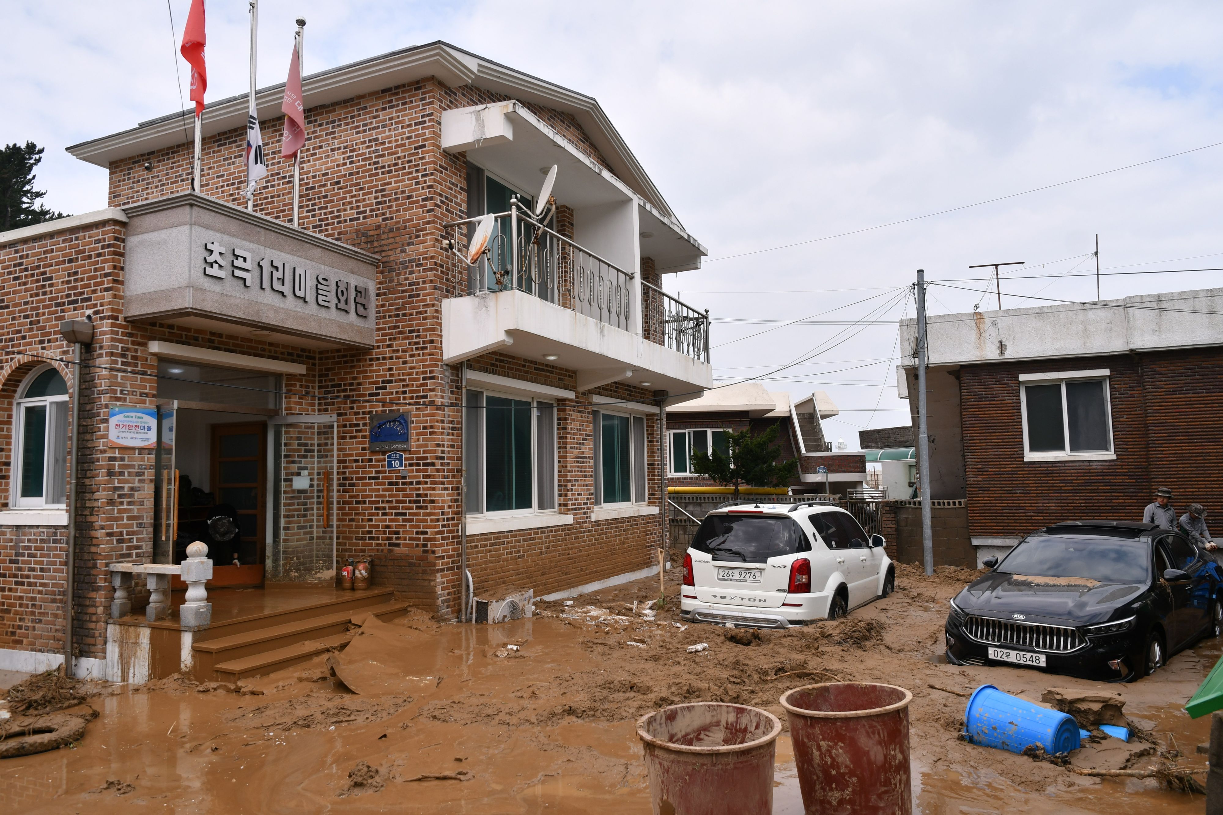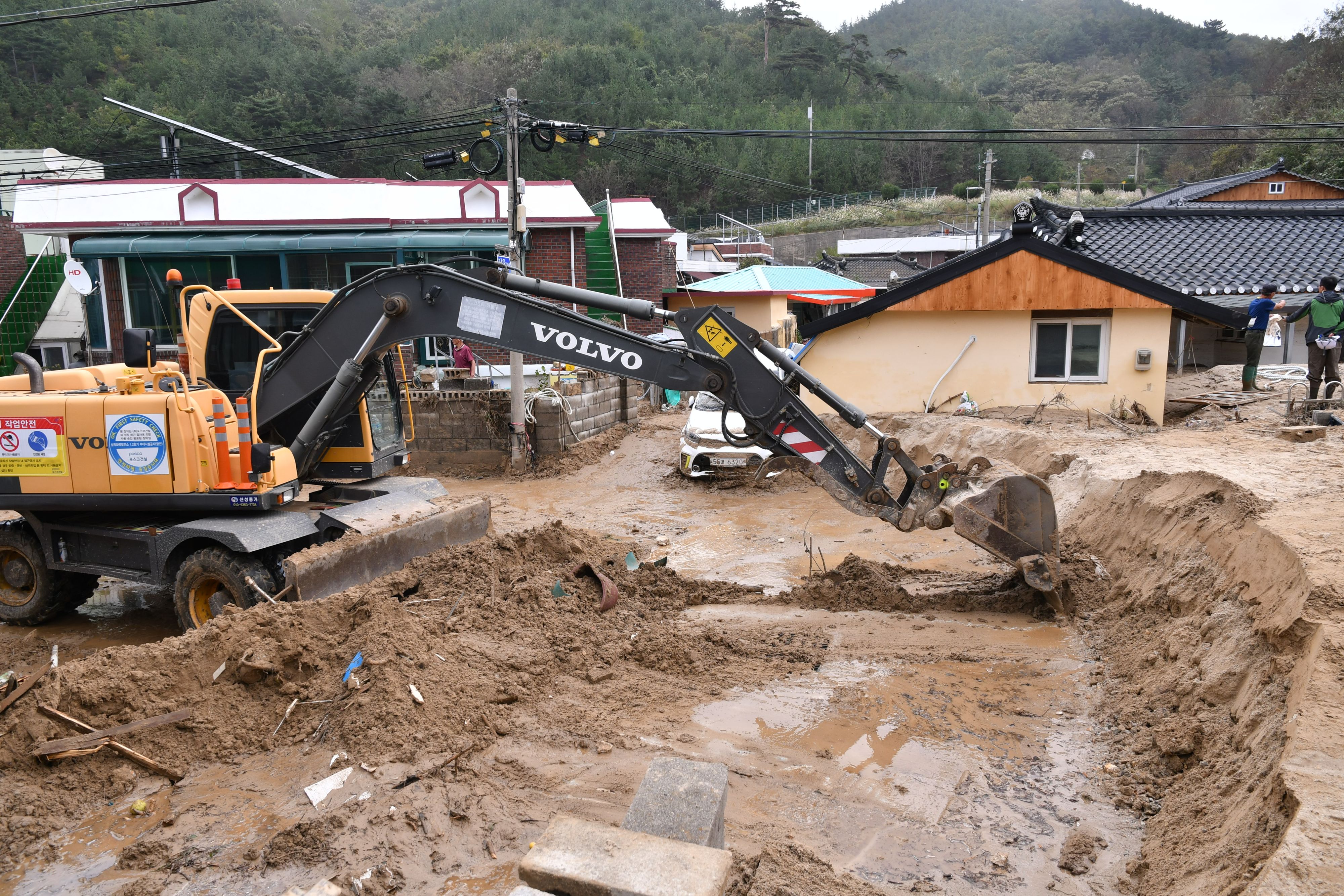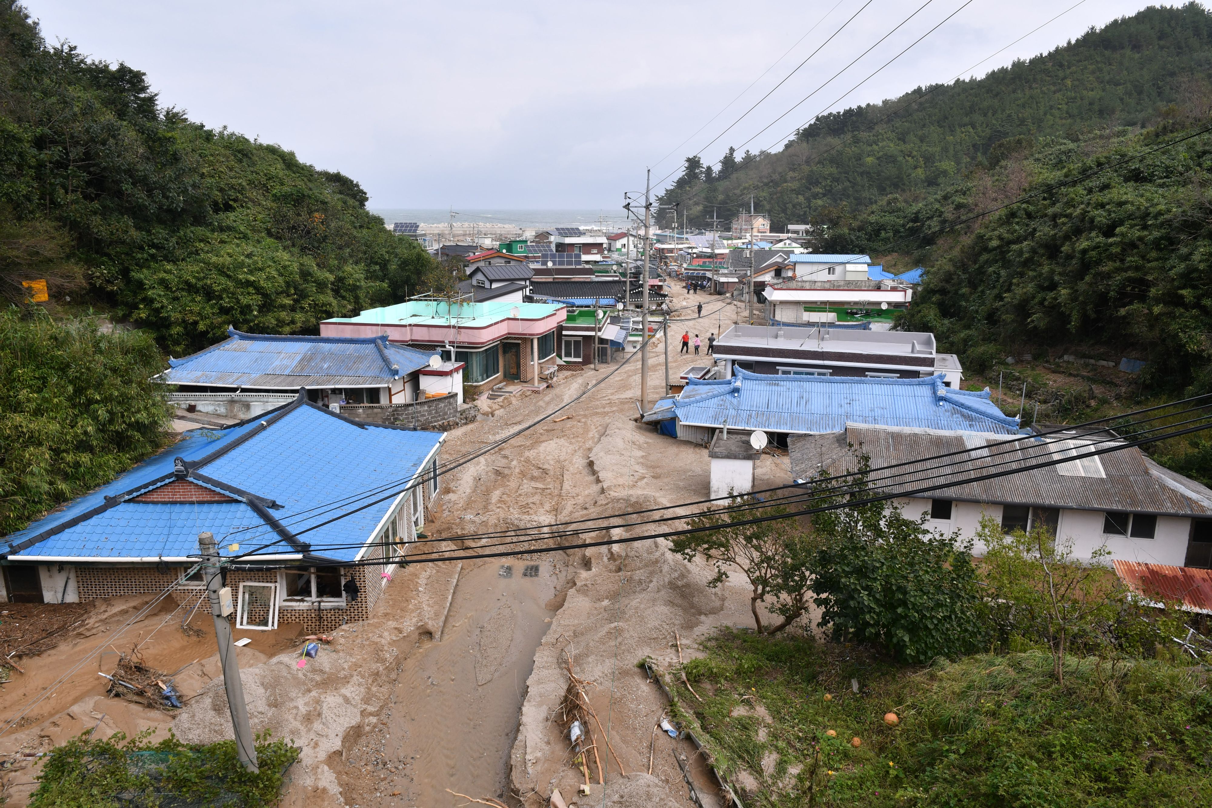 4일 오전 제18호 태풍 미탁으로 인해 강원 삼척시 근덕면 초곡마을이 토사로 뒤덮였다.
