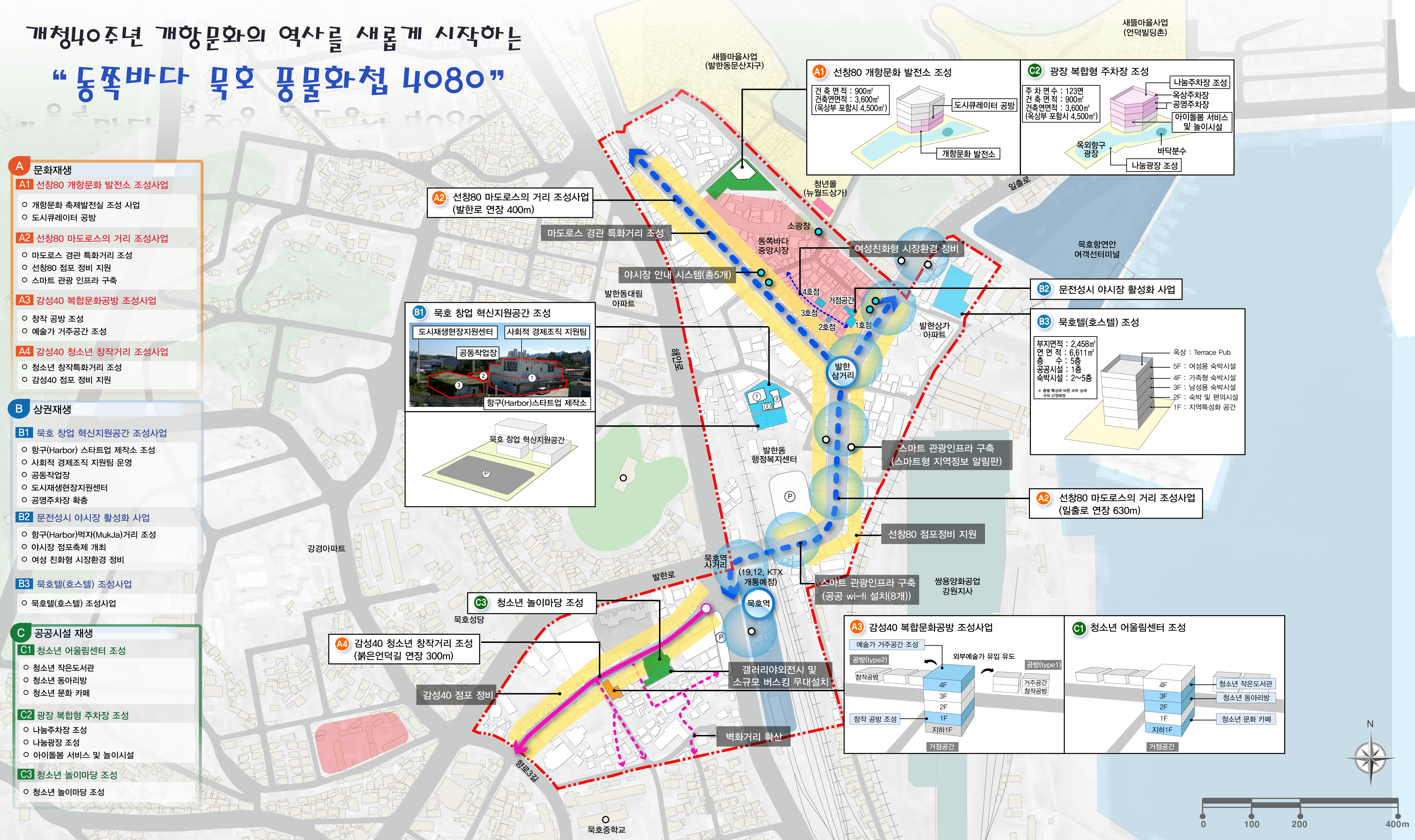 먼저 발한지구(중심시가지형) 도시재생 뉴딜사업은 발한동 244-1번지 일원 212,675㎡에 5년간 446.7억원(국비 150, 지방비 100, 공기업 55.9, 기금 40, 부처협업 35.3, 지자체 65.5)이 투입될 예정으로, 주요 사업으로는 ▲개항문화발전소 ▲마도로스거리 ▲복합문화공방 ▲청소년창작거리 ▲야시장 및 호스텔 조성 등이 추진되며 이를 통해 묵호의 항구문화와 감성문화를 재조명하여 거점시설(묵호KTX역, 여객터미널)간 연계성 강화와 지역 정체성 확립을 추구해갈 계획이다.