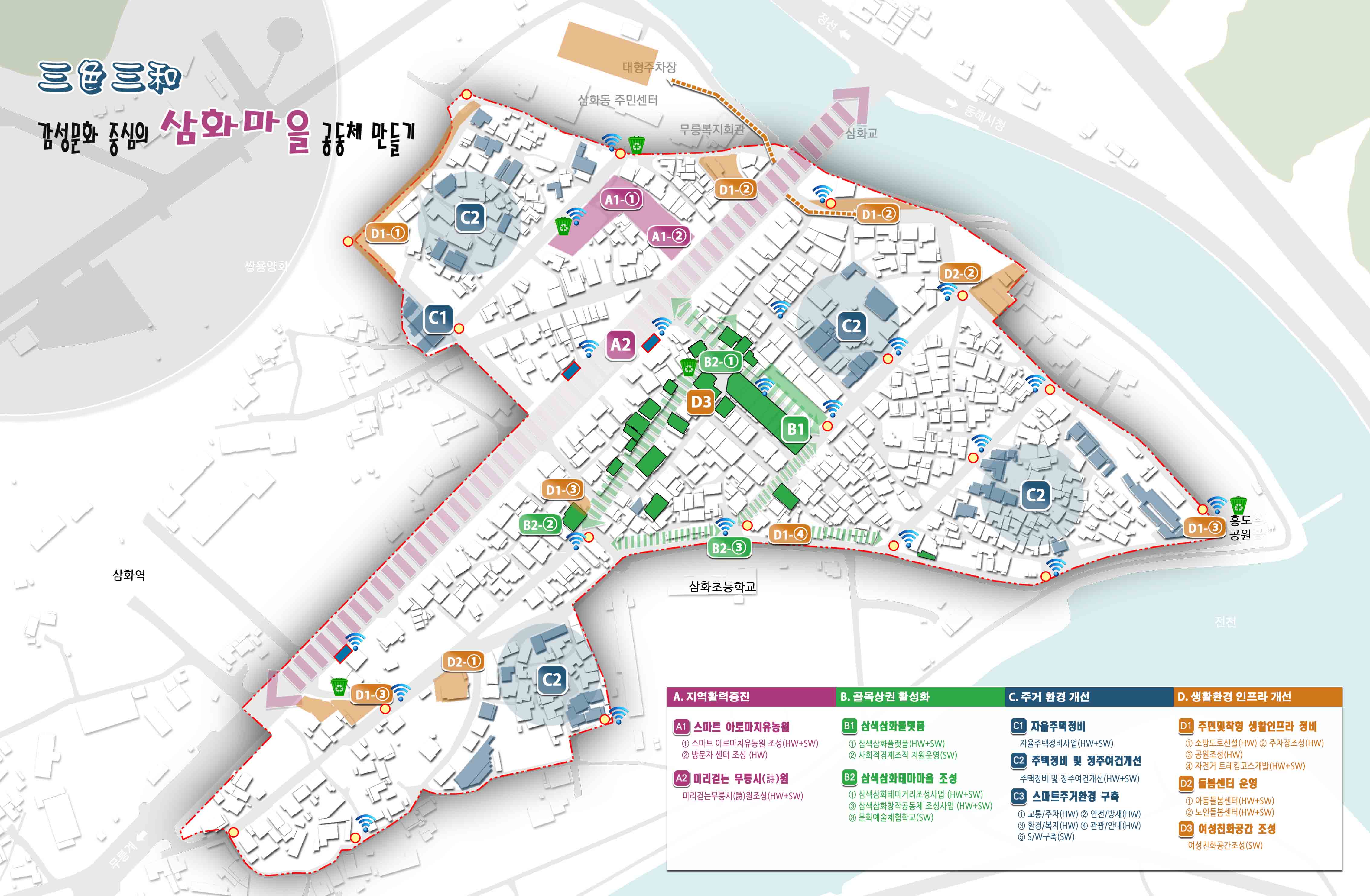 또한 삼화지구(일반근린형) 도시재생 뉴딜사업은 이로동 33-11번지 일원 150,307㎡에 4년간 1,870억원(국비 100, 지방비 68, 민간 7, 기금 33, 부처협업 1,675, 지자체 11)이 투입될 예정으로, 주요 사업으로는 ▲아로마 치유농원 ▲무릉시원 ▲플랫폼 ▲테마거리 ▲자율주택 ▲돌봄센터 등을 조성하여 골목상권 활성화 및 노후 불량주거환경 개선, 공동체 활성화를 위한 거점공간의 조성 및 운영, 공동체 역량강화 및 지역 네트워크 형성을 지원할 계획이다.