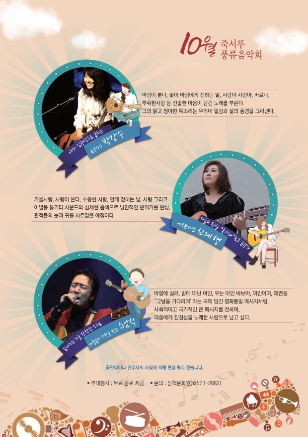 삼척시는 10월 문화의 날을 맞아 외지 관광객 및 시민들에게 죽서루와 문화예술의 도시인 삼척을 알리고, 추억거리와 힐링을 제공하고자 오는 10월 19일(토) 3시‘10월 죽서루 풍류음악회 - 가을을 노래하는 포크콘서트’를 개최한다.