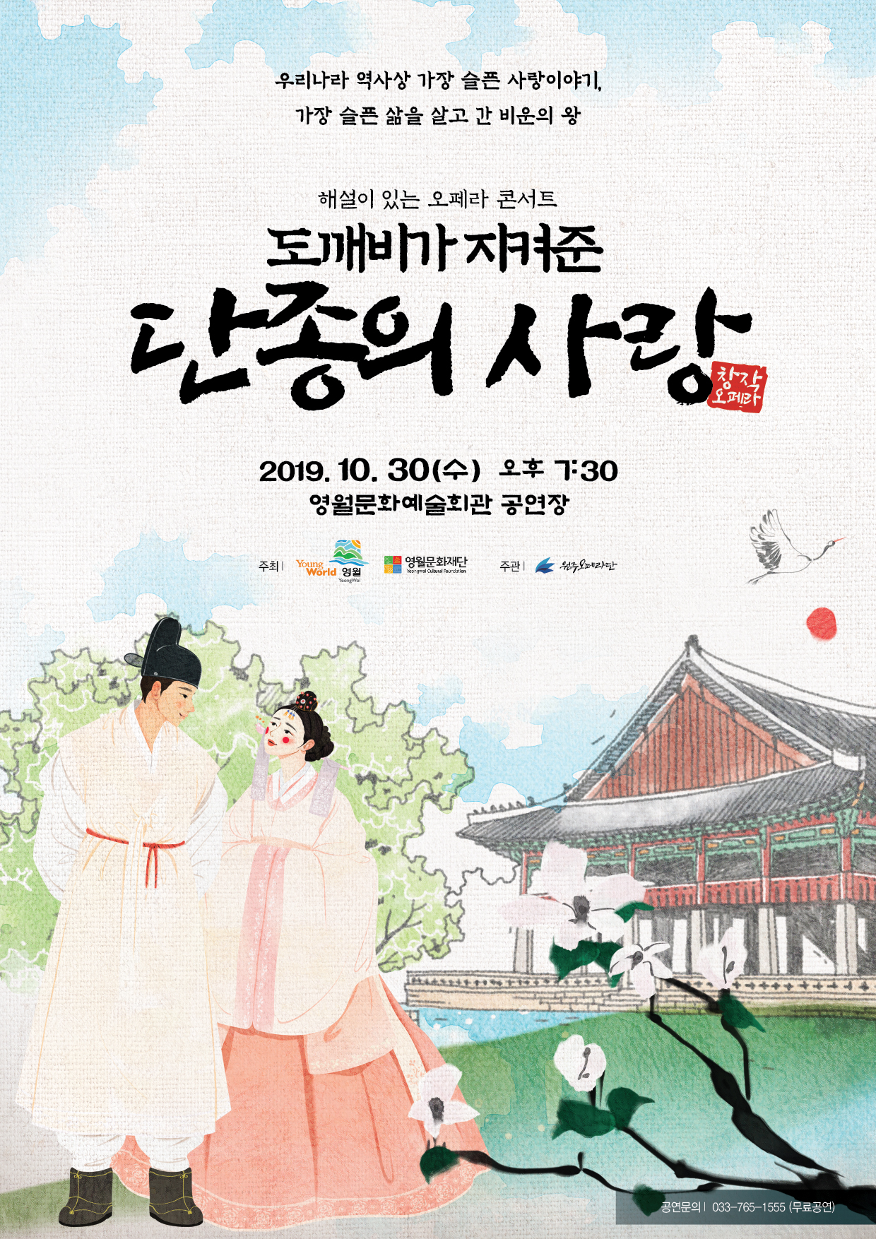 10월 30일(수)에는 해설이 있는 오페라 콘서트, 도깨비가 지켜준 ‘단종의 사랑’ 공연이 이어져 새로운 차원의 오페라를 선보일 예정이다. ‘단종의 사랑’은 세종대왕, 문종, 신숙주, 성삼문, 수양대군, 정순왕후 등 단종과 관련된 인물들을 중심으로 엮어 가며 단종의 비운, 단종의 사랑, 단종의 그리움을 표현할 예정이다.