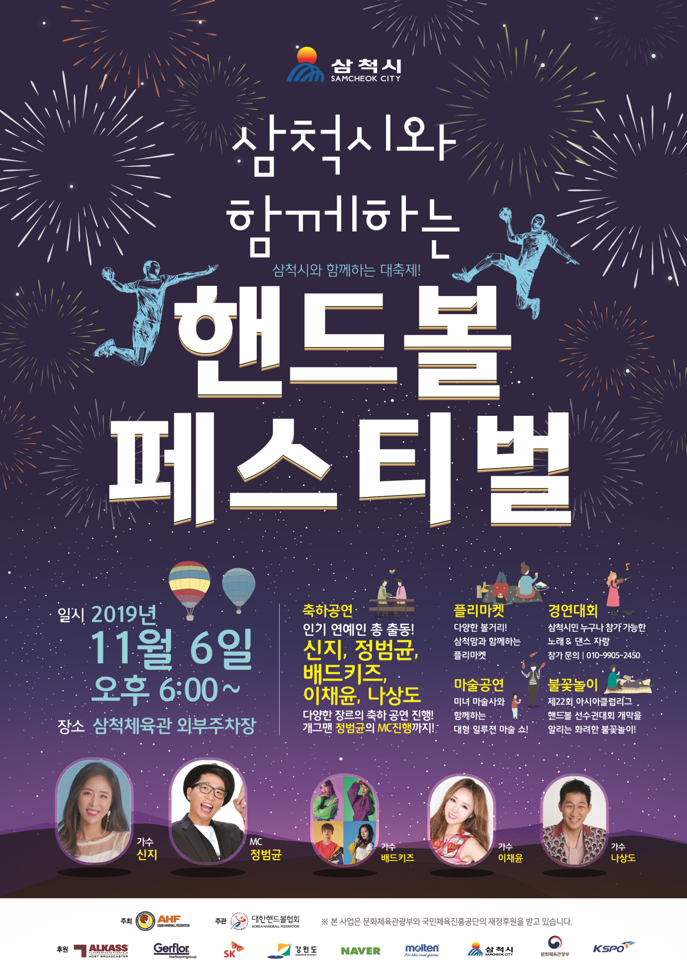 특히, 11월 6일(수)에는 ‘삼척시와 함께하는 핸드볼 페스티벌’ 전야제 행사가 오후 6시부터 삼척체육관 외부주차장에서 열리며, 개그맨 MC의 진행으로 인기가수 축하공연과 시민 노래‧댄스자랑, 마술공연, 불꽃놀이 퍼포먼스 등이 화려하게 펼쳐진다.