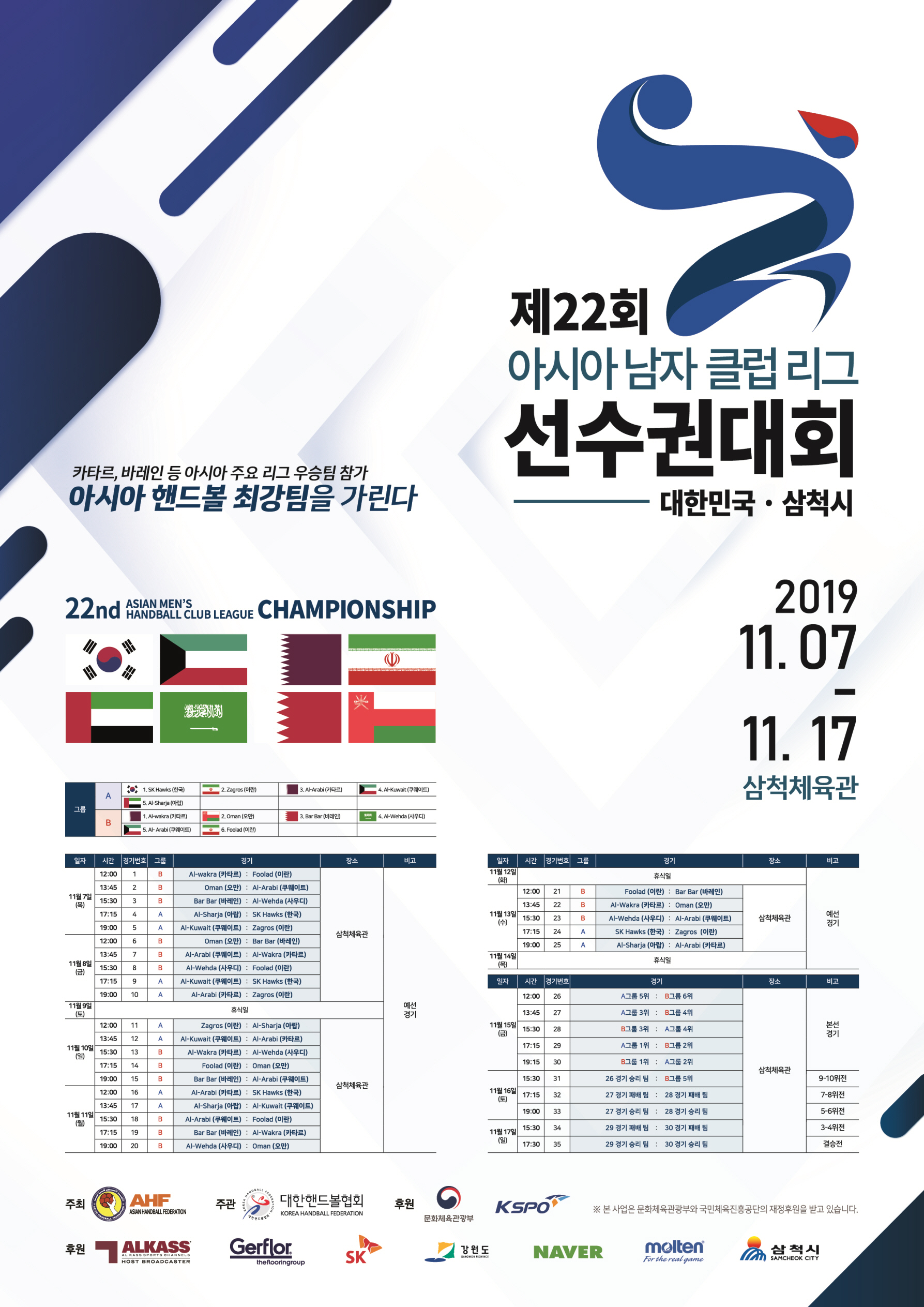 제22회 아시아남자클럽리그 핸드볼선수권 대회’가 오는 11월 7일(목)부터 17일(일)까지 11일간 삼척체육관에서 개최된다.