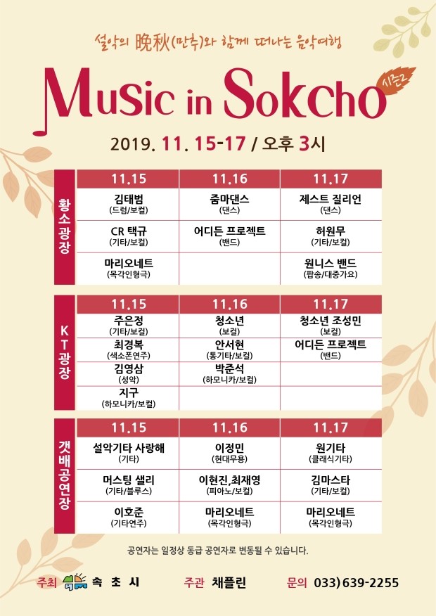 속초시는 가을 단풍철을 맞아 단풍놀이 관광명소인 우리시를 방문하는 관광객 및 시민들에게 눈으로 가을을 보고 귀로 가을을 느낄 수 있도록 “설악의 만추와 함께 떠나는 음악여행 Music in SOKCHO” 거리공연을 펼친다.