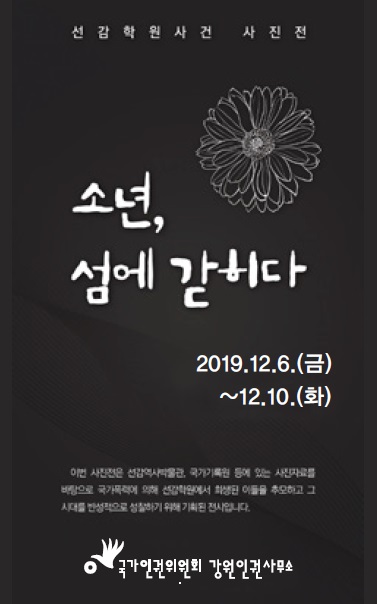 국가인권위원회 강원인권사무소(소장 송호섭)는 오는 6일 오후 2시 강릉 명주예술마당에서 선감학원 사진전 개막식 및 강연회를 개최한다.