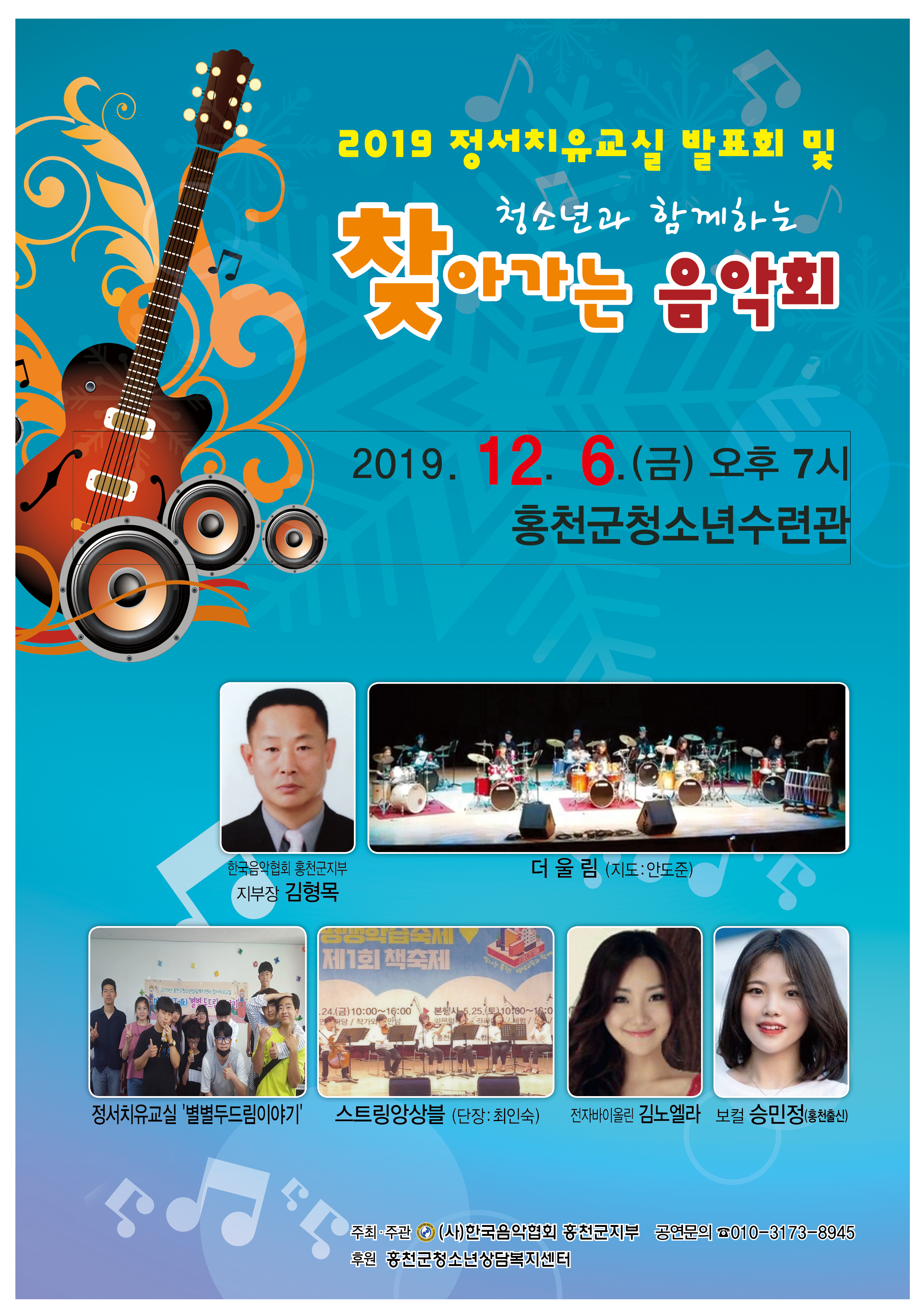 이 날 음악회는 홍천군청소년수련관의 학생들과 관내 학생들이 참석한 가운데 홍천군 평생학습 우수동아리로 3년 연속 선정되고 홍천악기동아리 경연대회에서 은상과 금상을 수상했던 ‘더울림’의 드럼연주와 KBS 나는 가수다 특집방송에서 전자현악으로 가수 김조한과 협연했던 김노엘라씨가 출연한다.