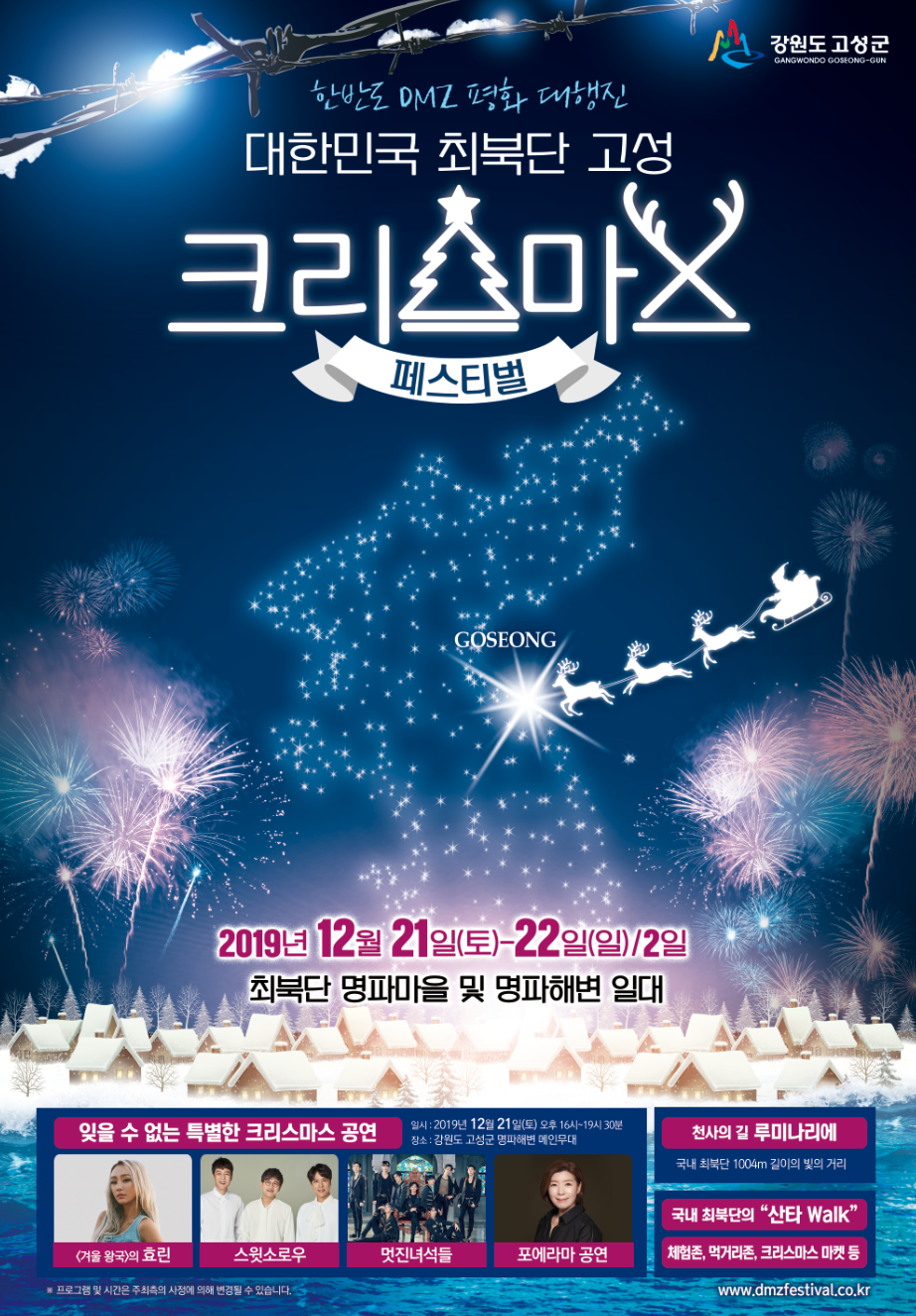 고성군(군수 이경일)은 오는 21일과 22일 이틀간 대한민국 최북단 현내면 명파리(명파해변 포함)일원에서 고성“크리스마스 페스티벌”을 개최한다.