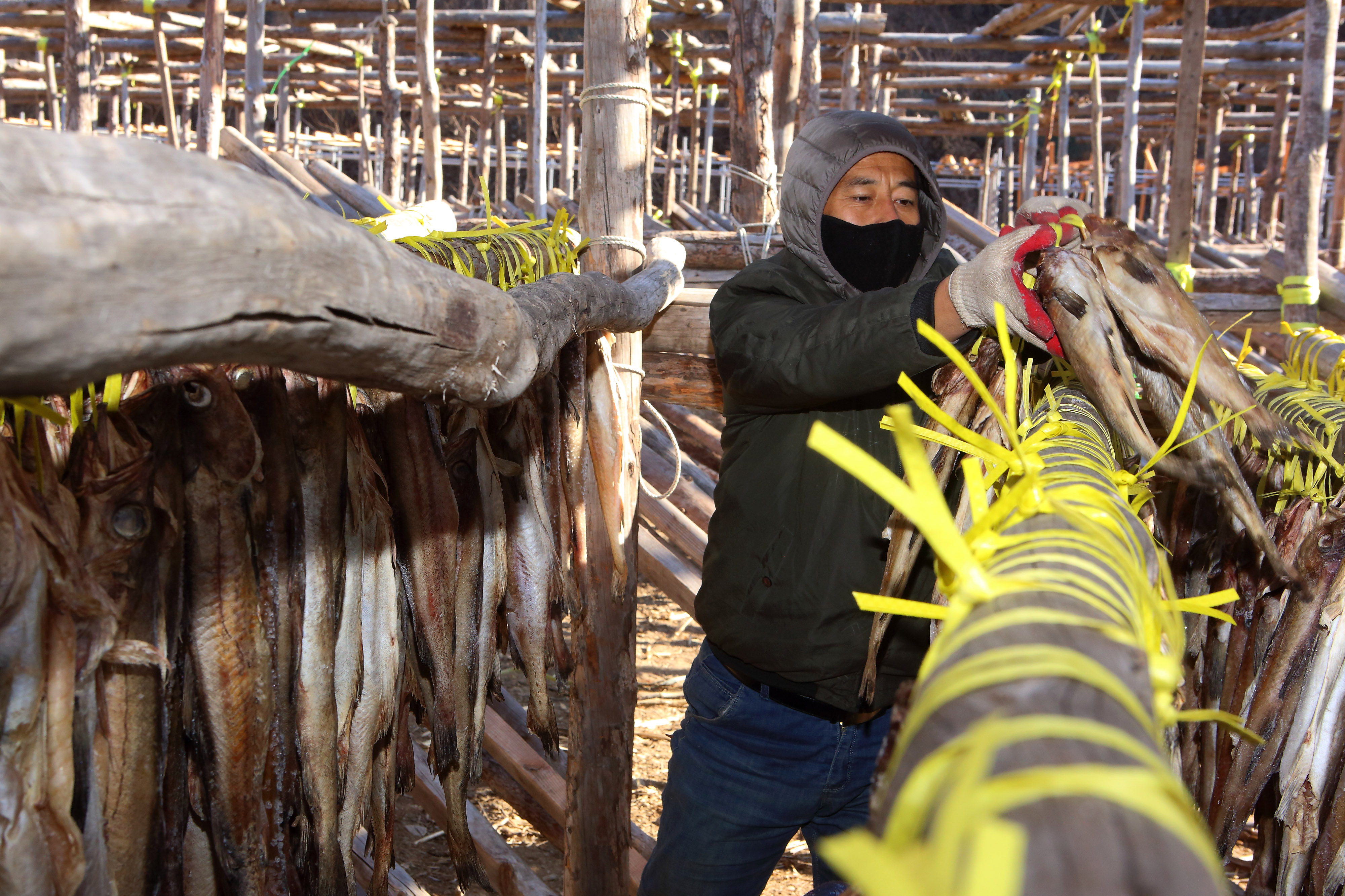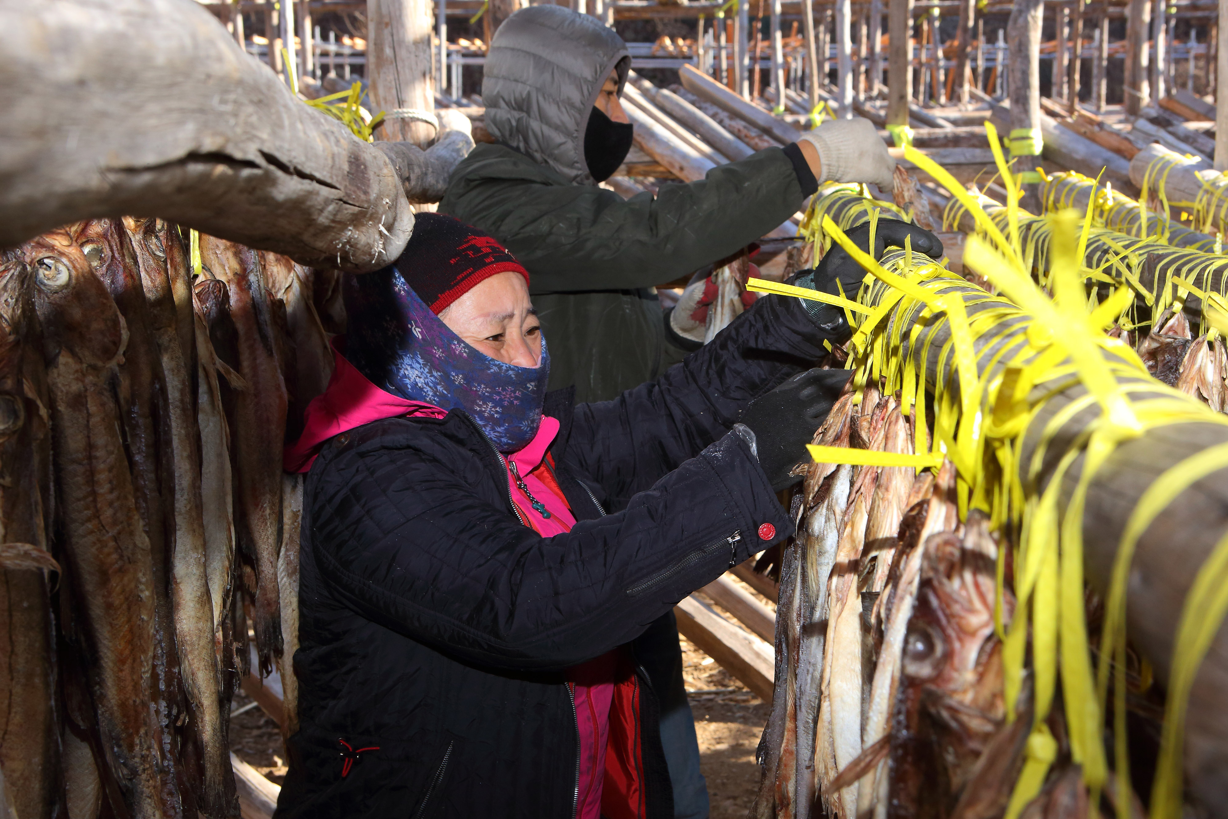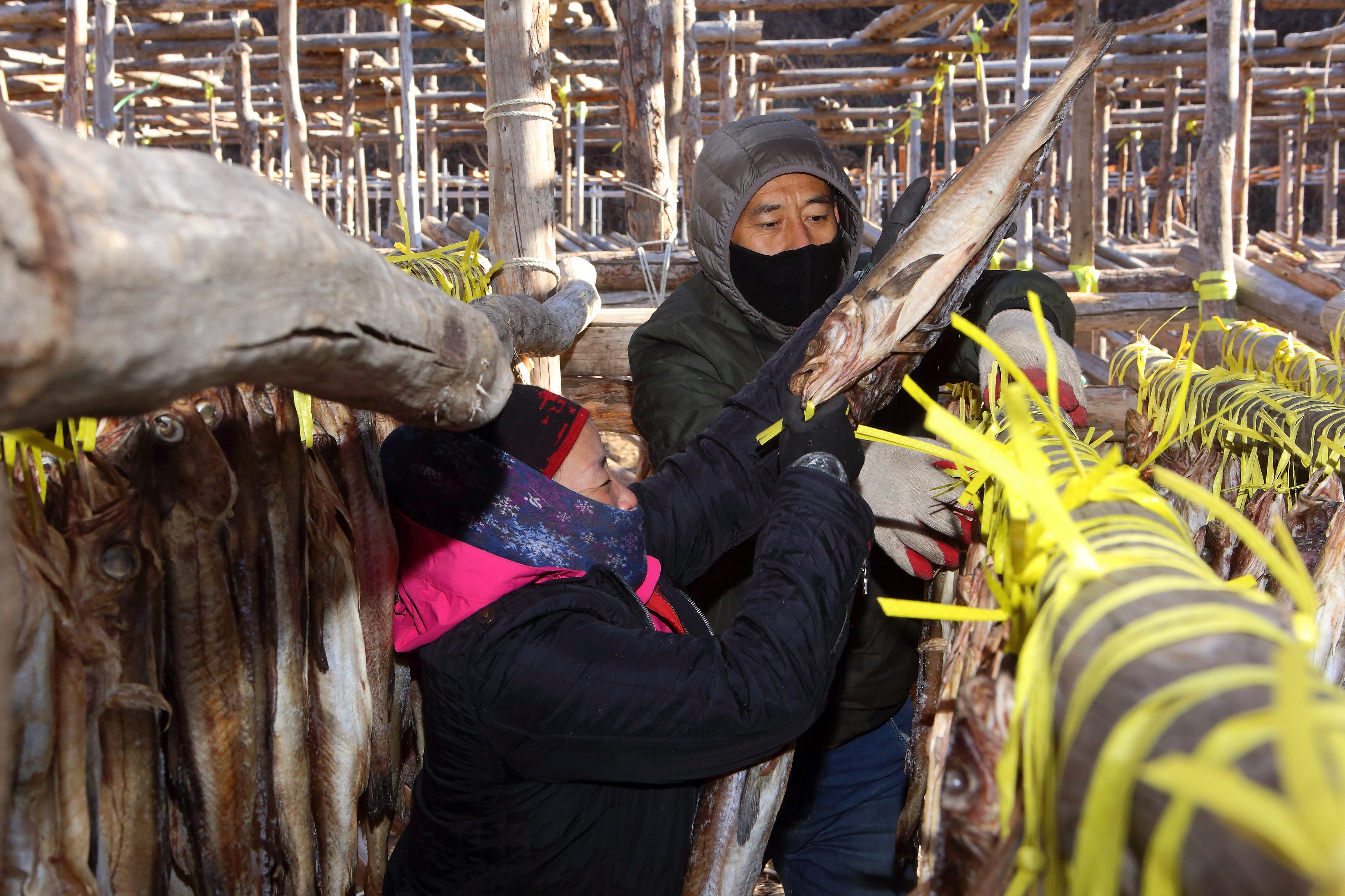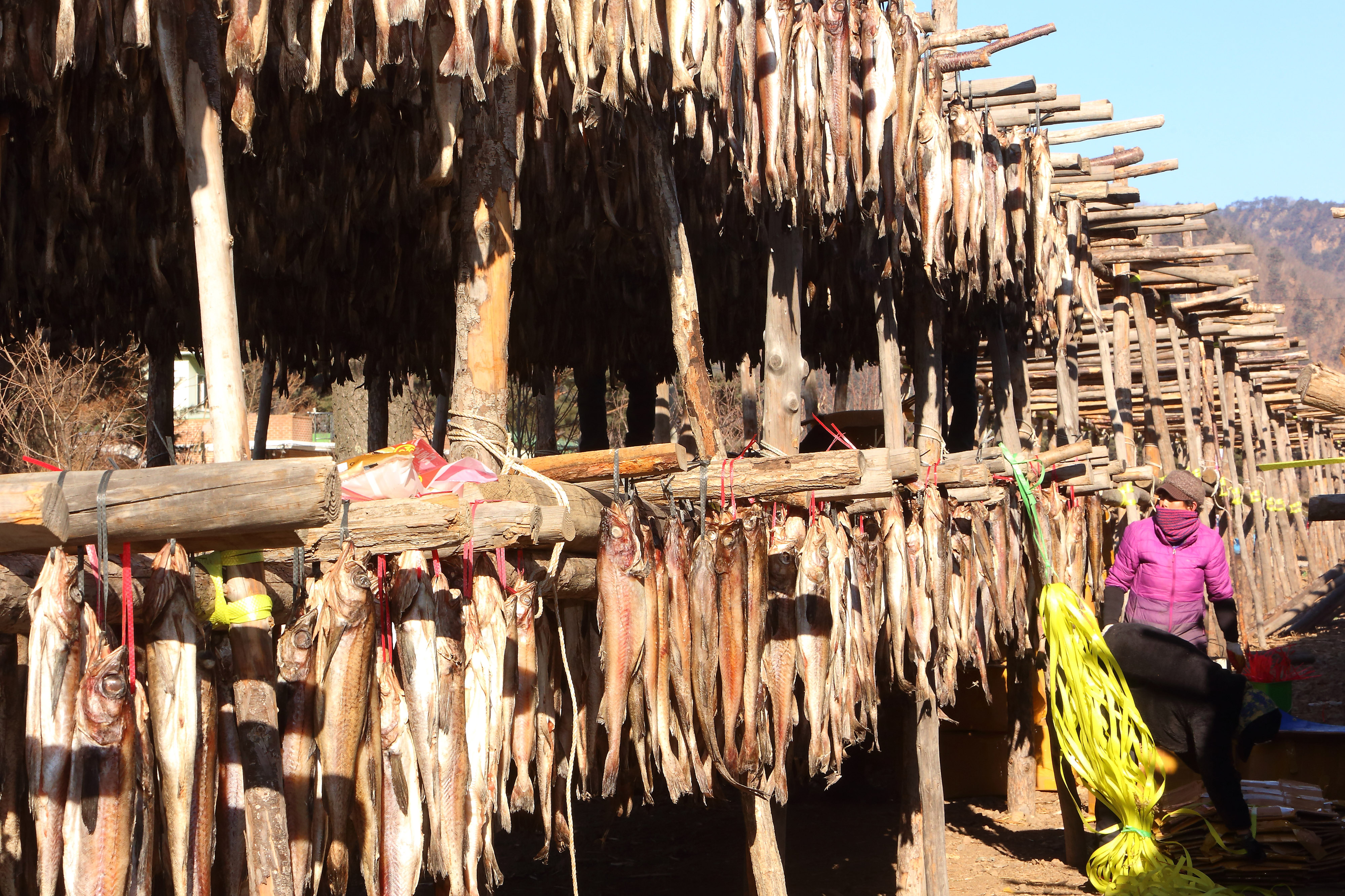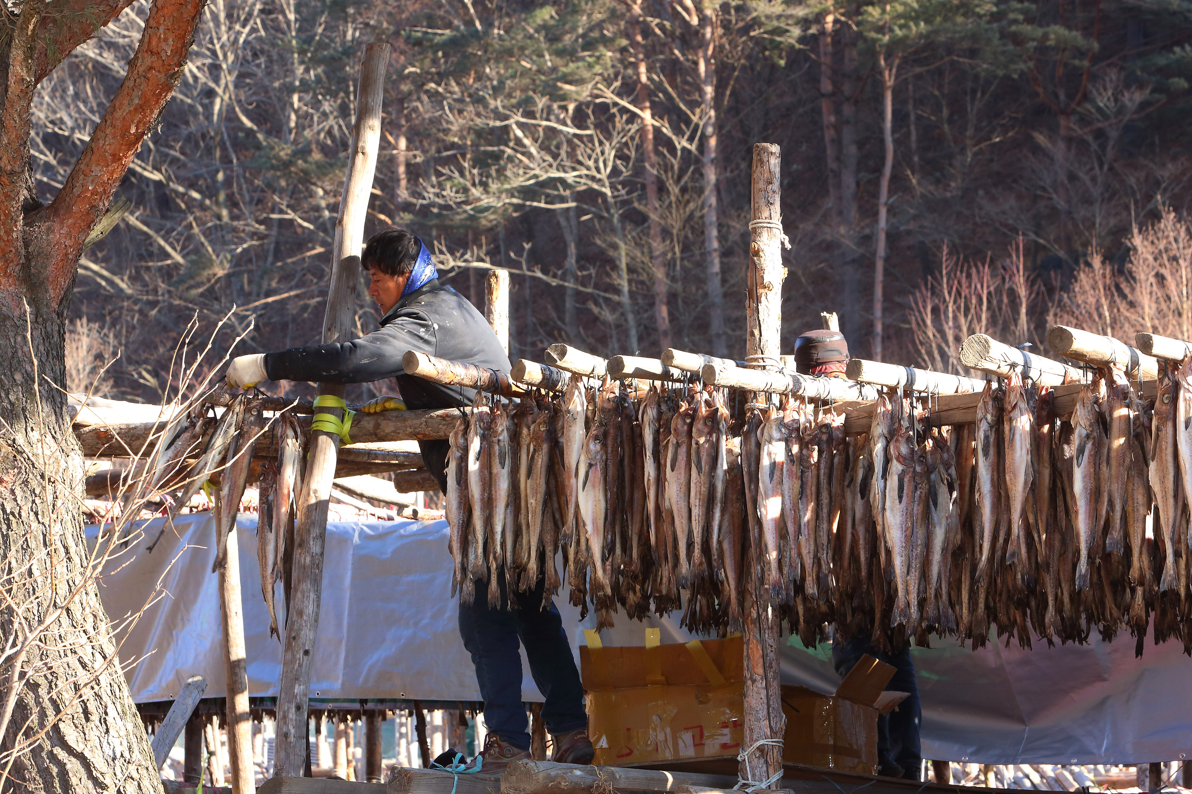 강추위가 시작된 지난달 31일 인제 북면 용대리 주민들이 황태덕장에 명태를 내거는 덕걸이 작업을 하고 있다.