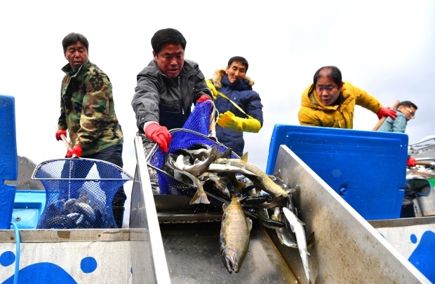 지난 30일 산천어를 가득 싣고 경북 울진에서 출발한 활어차의 첫 물량 800㎏이 축양장의 수조로 옮겨졌다.