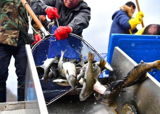 화천군은 지난해 연말부터 전국 각지 19개 양식장에서 하남면 논미리 축양장으로 산천어의 수송을 개시했다.