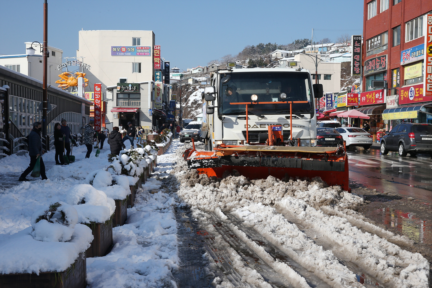 특히, 시에 따르면 이번 강설시에는 도로 경사지 취약 구간인 국도7호선 양지마을, 해안로 일정아파트 앞과 평생학습관 앞 등 6개 지점에 설치한 염수분사장치 운영이 경사지 빙판길 발생과 교통사고를 예방하는데 톡톡한 효과를 거두었다고 밝혔으며, 금일중 간선도로와 이면도로, 보도 등에 대한 제설작업을 마무리하여 시민 불편이 최소화 되도록 최선을 다할 계획이라고 밝혔다.