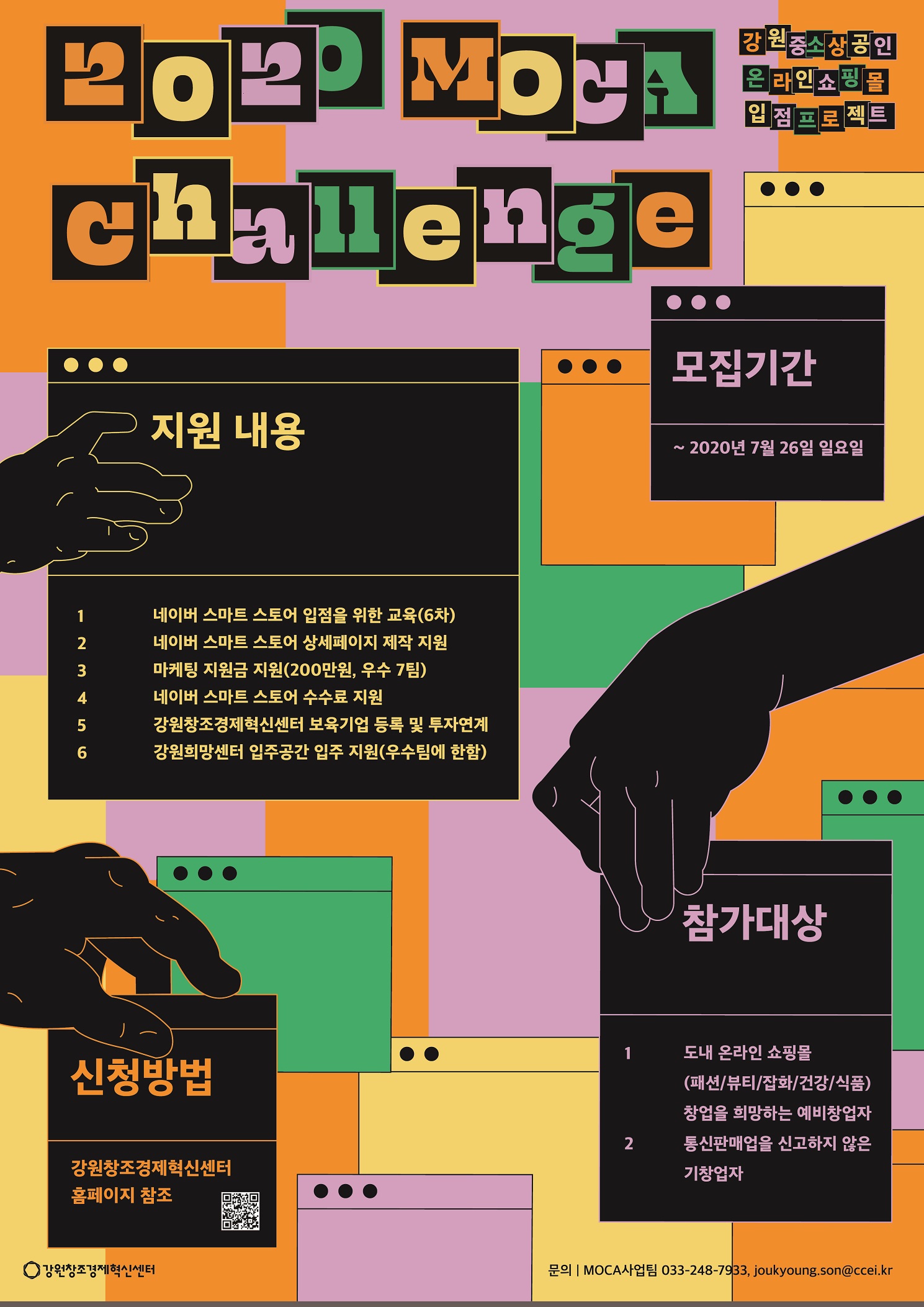 강원창조경제혁신센터(센터장 한종호, 이하 ‘강원혁신센터’)가 도내 중소상공인의 온라인 판로 확대를 지원하는 ‘2020년 MOCA 챌린지 창업 프로그램’의 참가자를 모집한다고 밝혔다. *MOCA(MObile Commerce Acceleration)