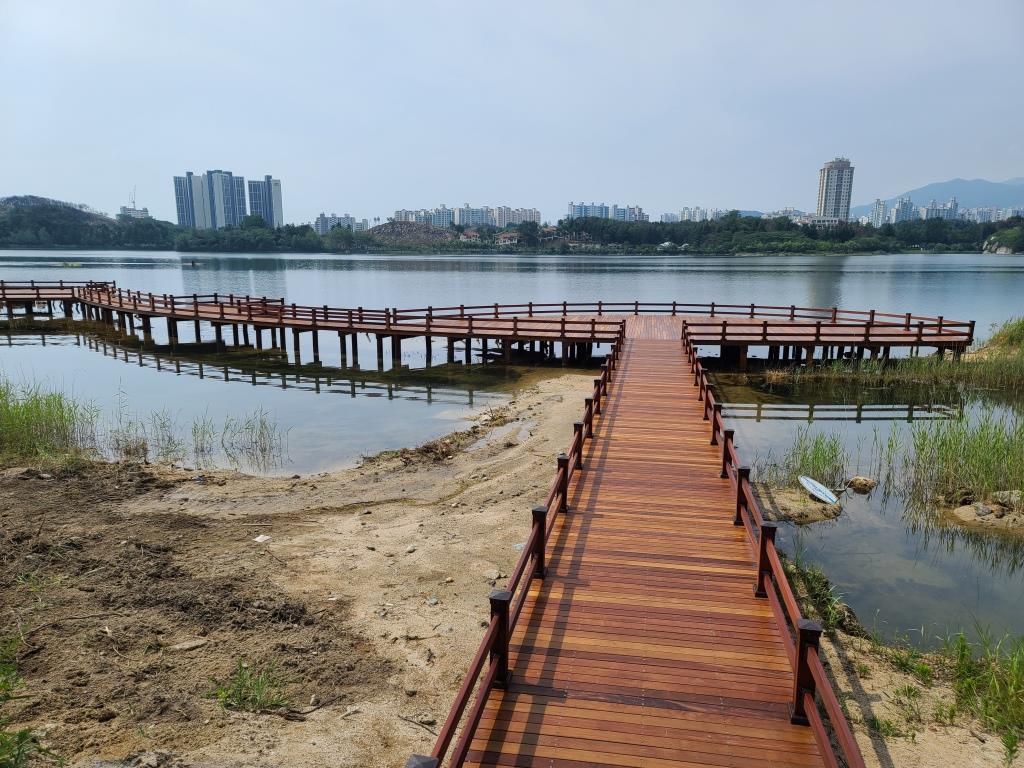 또한 이번 데크 복구에 사용된 자재는 자연호수에 설치하는 데크의 특성에 맞게 방부약품처리나 플라스틱 등이 사용되지 않은 친환경 천연 방부목인 아이언우드를 기반으로 목재의 색상과 무늬 등이 호수 경관과 조화를 이룰 수 있게 설치했으며, H빔이나 아연각관 등 철재류를 기반으로 한 기존 데크와는 전혀 다른 신개념 생태데크로서 최소 30년 이상의 내구성 유지 및 기존 데크에서 발생했던 사후관리 문제 등도 최소화될 것으로 보인다.