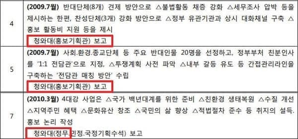 저는 특히 박형준 후보가 보고받은 내용에 주목합니다. 홍보기획관과 정무수석이 보고받을 수밖에 없는 이유가 들어있기 때문입니다. 보고서에는 4대강 사업 반대단체들에 대한 견제 수단으로 ‘세무조사 압박’을 거론하고, 친분 있는 인사를 이용하여 ‘내부 갈등을 유도’한다고 써있습니다.