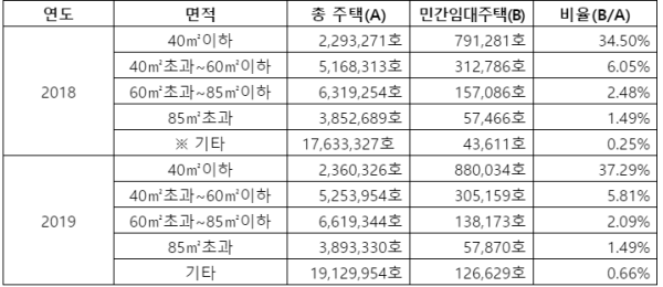 소형 주택 물량 공급은 계속 늘어났지만, 주택임대사업자가 매입한 주택 수는 이보다 더 많았다. 소형 주택은 2018년 229만 3천 호에서 2019년 236만여 호로 6만 7천 호 증가했는데, 같은 기간 민간임대주택은 공급 물량보다 2만 2천 호 많은 약 8만 9천 호가 증가했다. 주택 공급량보다 주택임대사업자의 주택 매입이 더 많았던 것이다. 주택임대사업자가 소유한 소형 주택 소유량은 2018년 79만 1281호에서 2019년 88만 34호로 늘었으며, 작년 6월까지 96만 997호로 늘어, 해마다 상승폭이 커지고 있다는 사실도 밝혀졌다.