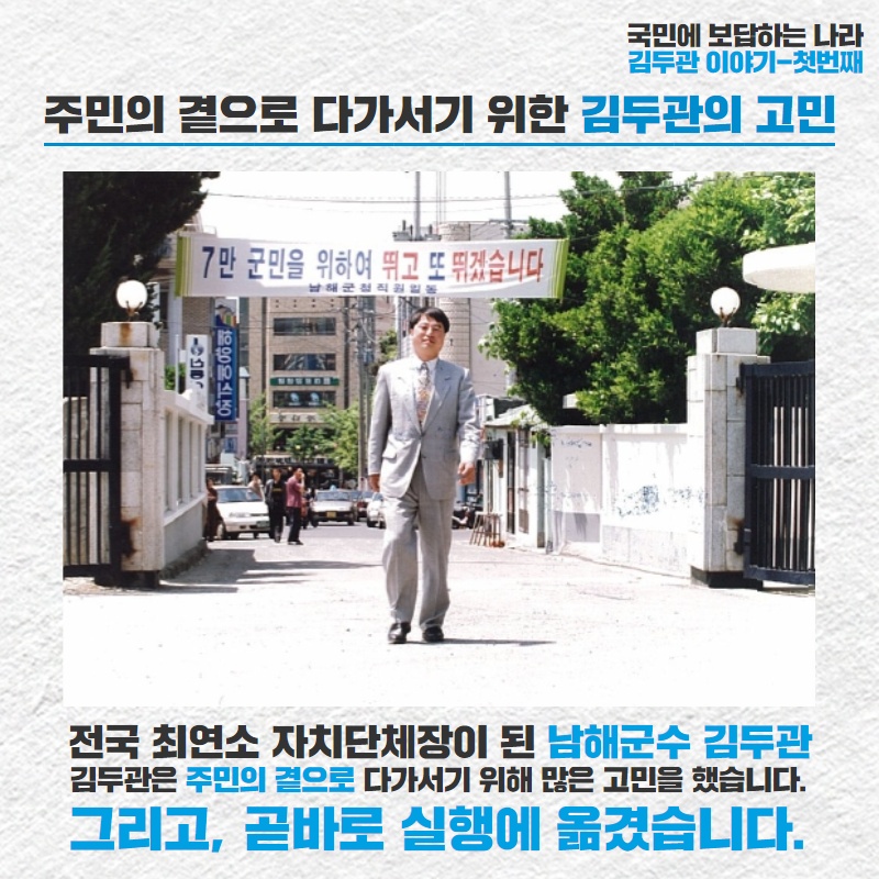 1995년, 37세 나이로 남해군수 선거에서 무소속 출마한 김두관은 '전국 최연소 자치단체장'의 기록을 세우며 당선됐습니다. 사람들은 김두관의 당선을 두고 '기적'이라고 했습니다.